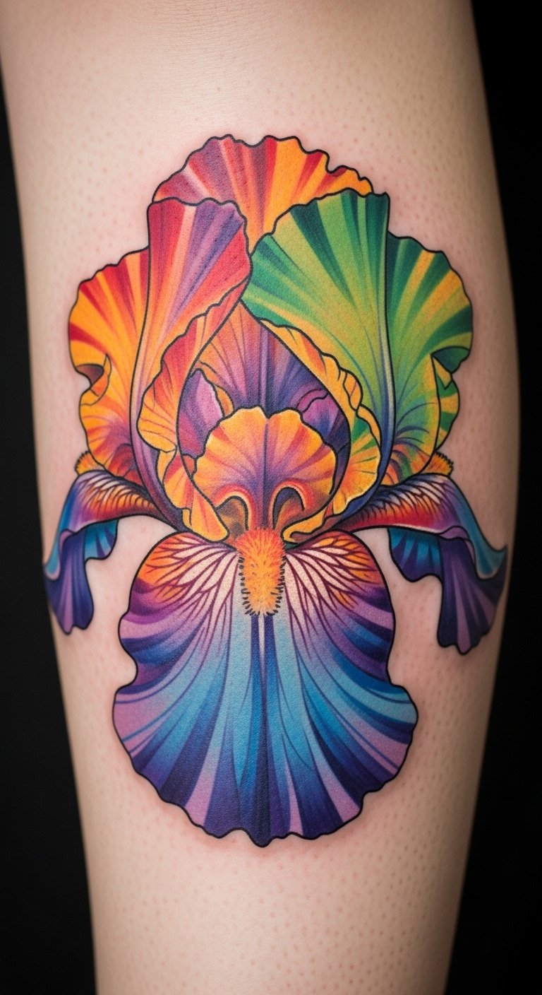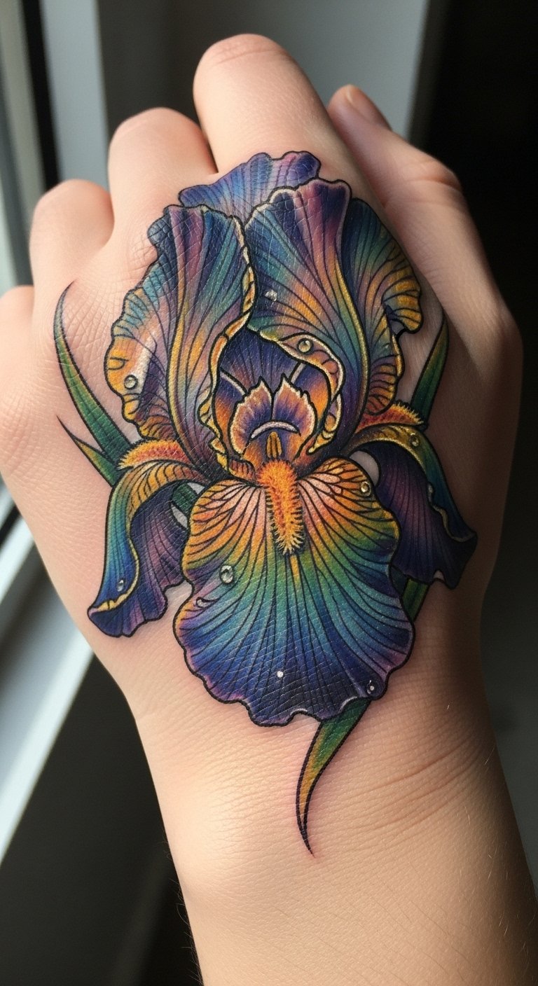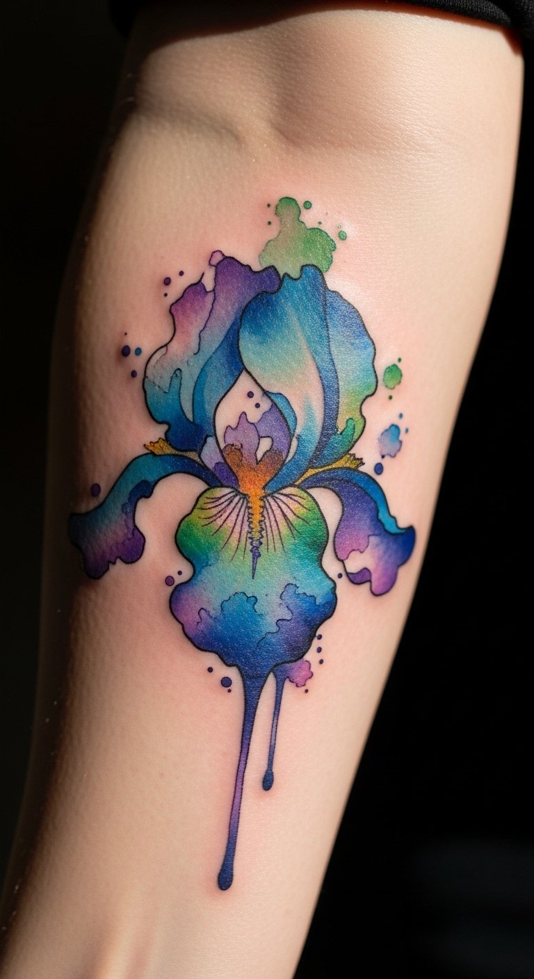 A watercolor style iris looks like painted art. See soft blends of color on your skin. This design feels artistic and modern. Experiment with watercolors at home. Find artists for $100 or less. Keep blends loose for charm. Try painting on fabric. Get it in a single visit. Protect with breathable clothing. Use washable paints for previews.