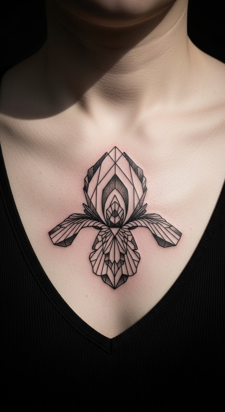 A geometric iris design mixes shapes and flowers. Picture triangles inside petals on your chest. This style adds a modern twist. Draw geometric patterns with rulers at home. Search for designers under $110. Use simple shapes to cut costs. Sketch on cardboard first. Book when you have time. Clean the area daily. Try paper cutouts.