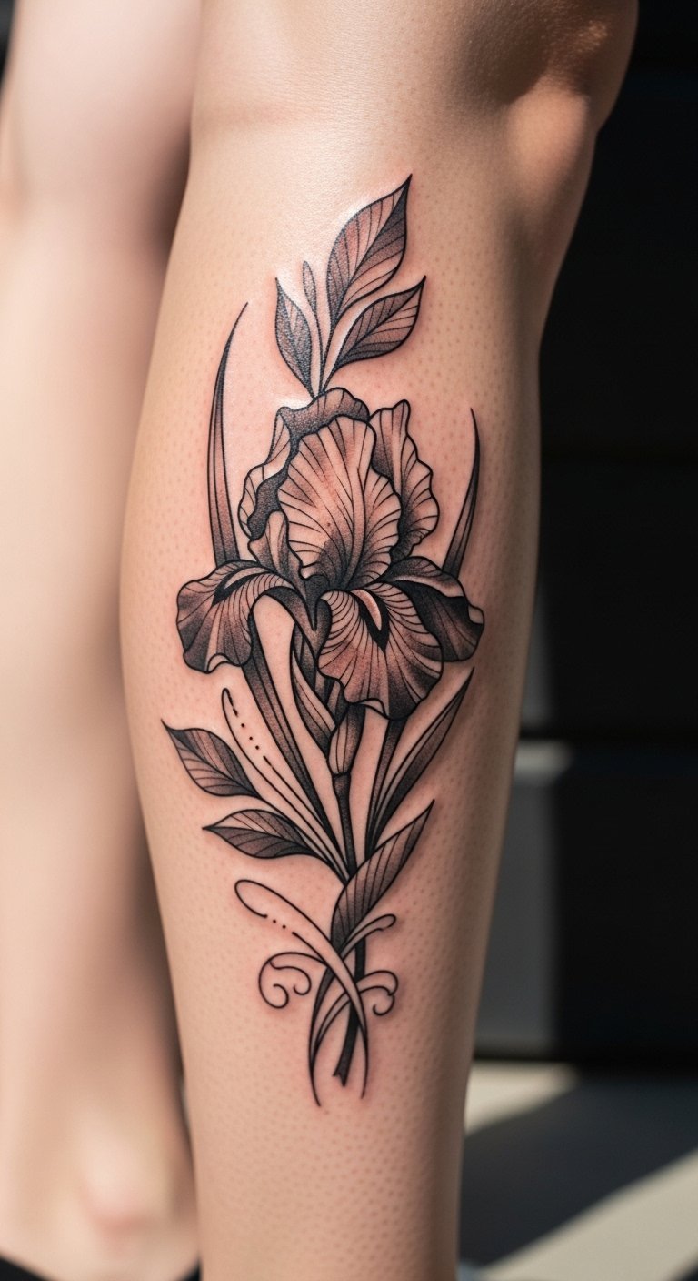 An iris with leaves creates a full scene. Think of green accents around the flower on your calf. This adds a natural story. Draw leaves with green crayons. Artists may offer it for $80. Keep elements balanced. Practice on paper. Schedule flexibly. Use plant stickers as stand-ins. Moisturize often.