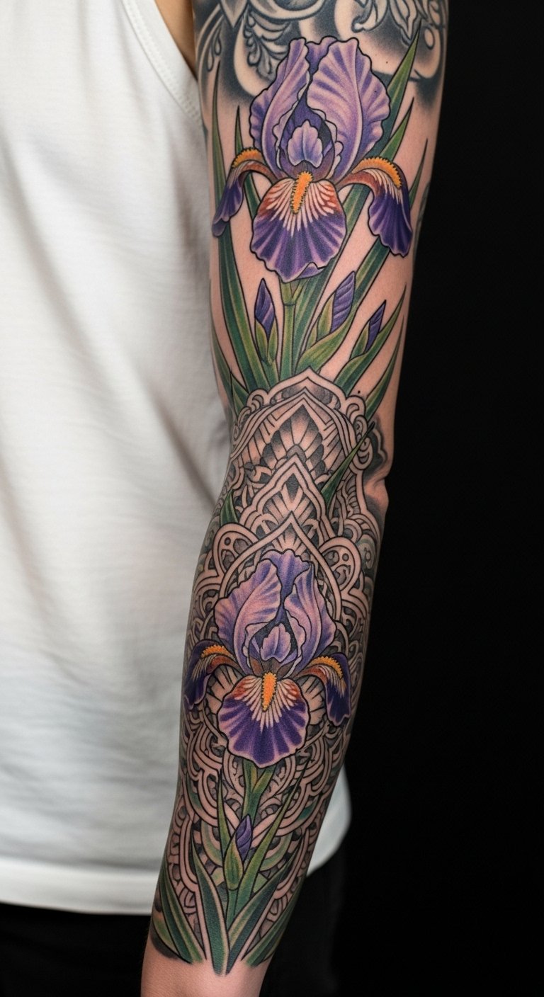 A full sleeve iris covers your arm in beauty. Picture a cascade of flowers from shoulder down. This is for big commitments. Sketch the whole arm at home. Look for sleeve deals at $200. Break it into sessions. Draw on sleeves first. Plan over time. Care with sleeves on.