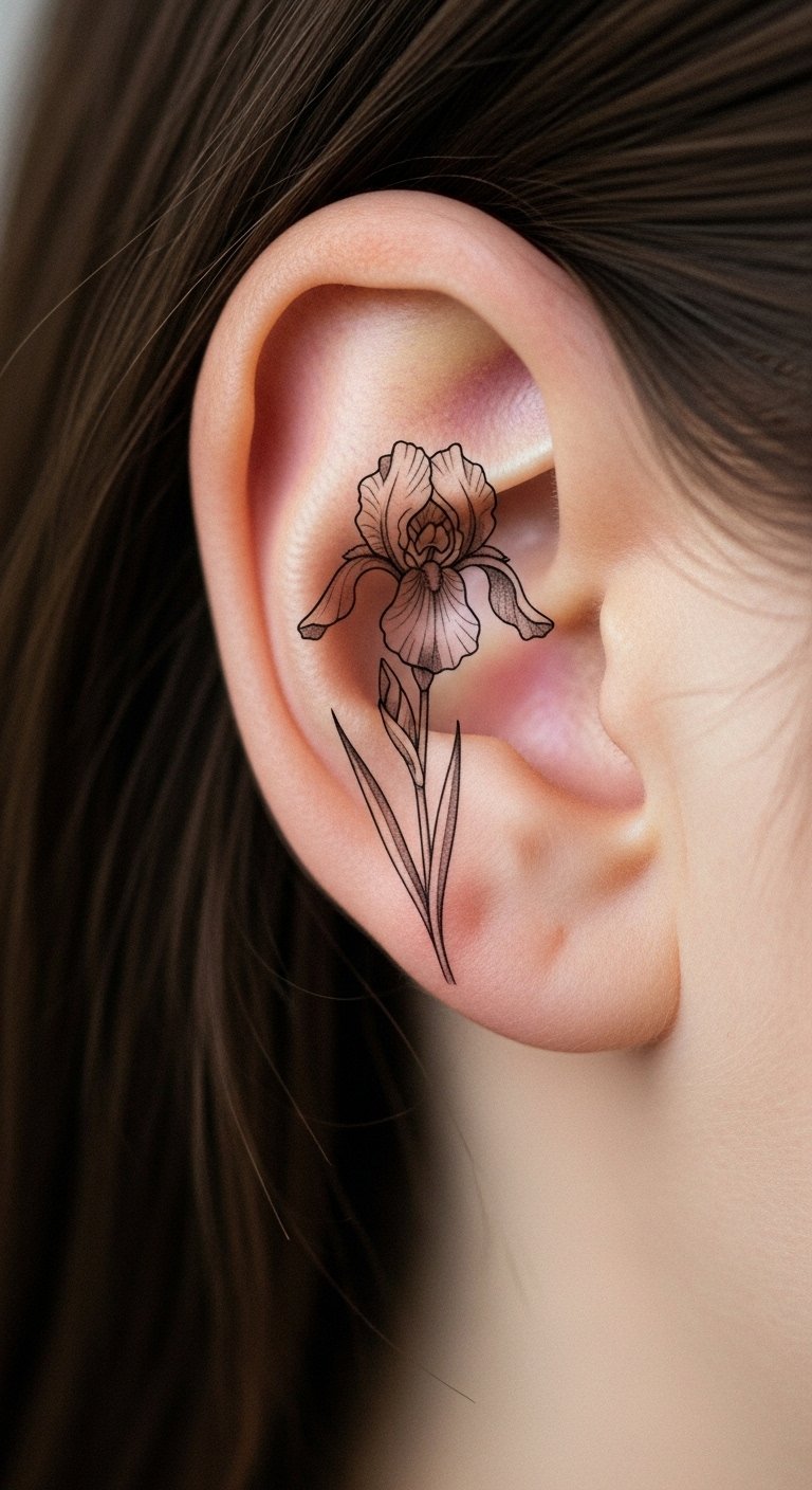 A small ear iris hides in plain sight. Think of a mini flower behind your lobe. This is subtle and sweet. Draw with ear buds for scale. Artists charge $40. Keep it tiny. Try with ear drawings. Get it fast. Hide with hair. Use fake tattoos.