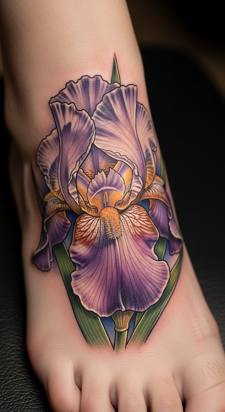 A realistic foot iris mimics real blooms. See detailed petals on your sole. This design feels alive. Practice with foot sketches. Find realists for $70. Use photo references. Draw on feet first. Book carefully. Protect with shoes. Try foot stamps.