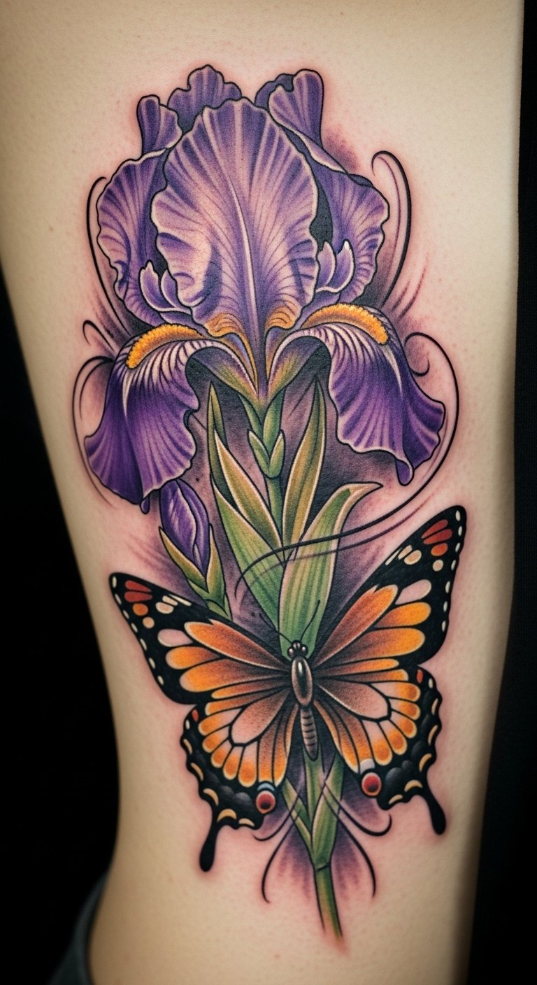 An iris and butterfly combo tells a story. Picture wings around the flower on your ribs. This adds movement. Draw both on paper. Look for combos at $90. Balance the elements. Practice drawing pairs. Schedule as needed. Cover if sensitive. Use themed decals.