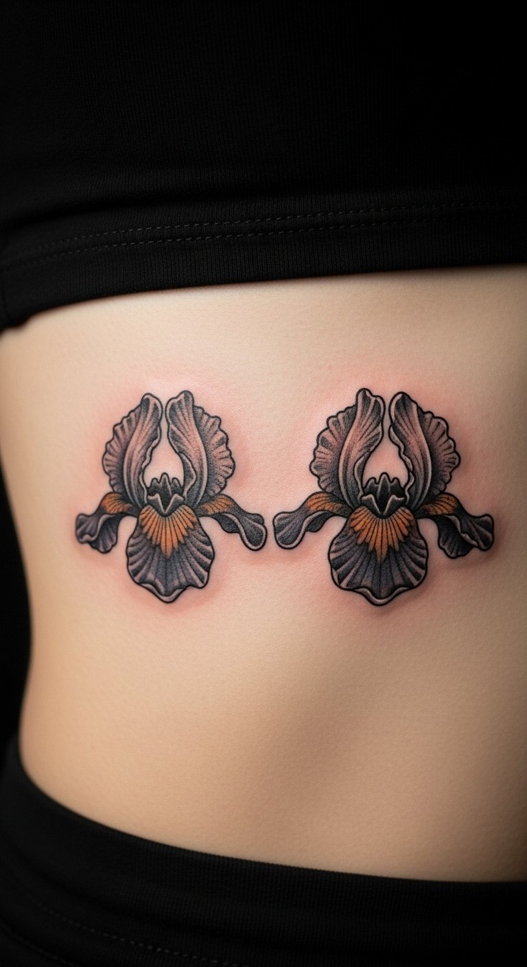 Double iris on ribs means two for one. See mirrored flowers on your side. This is symmetrical fun. Sketch pairs at home. Artists charge $100. Keep them even. Draw on both sides. Get in one go. Protect the area. Try double stickers.