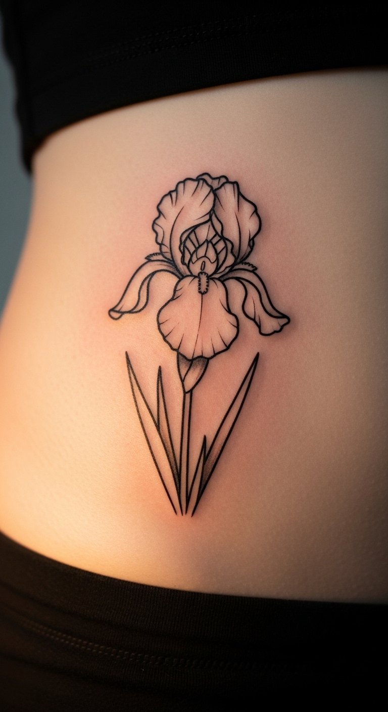 An outlined iris on hip is clean and clear. Think of just the edges on your curve. This is versatile. Use markers for outlines. Find hip artists for $60. Add fills later. Sketch on hips. Do quickly. Wear comfy clothes. Test with outlines.