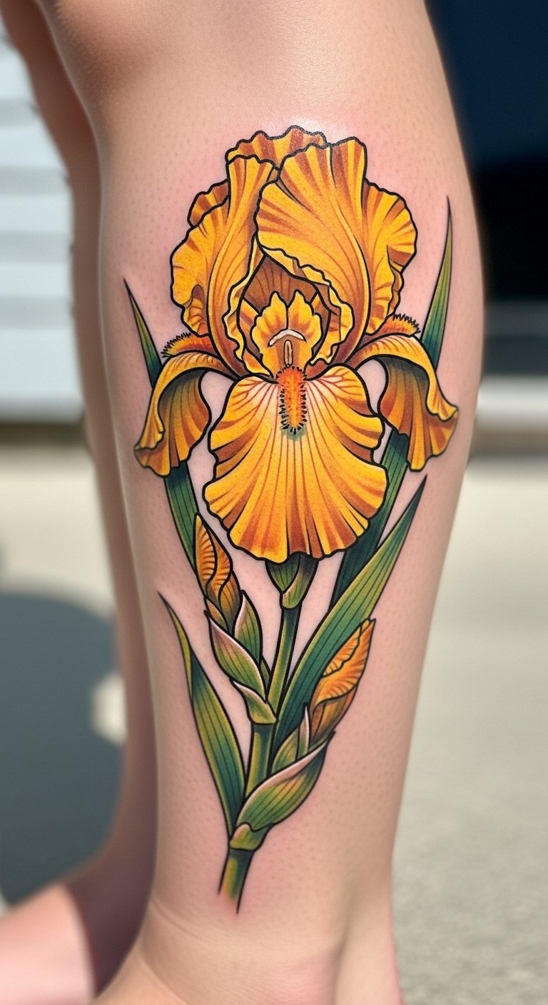 A bright yellow iris brings sunshine. Envision golden petals on your leg. This lifts spirits. Color with yellow markers. Find for $70. Keep it bright. Sketch sunny designs. Get in the morning. Protect from sun. Use yellow stickers.