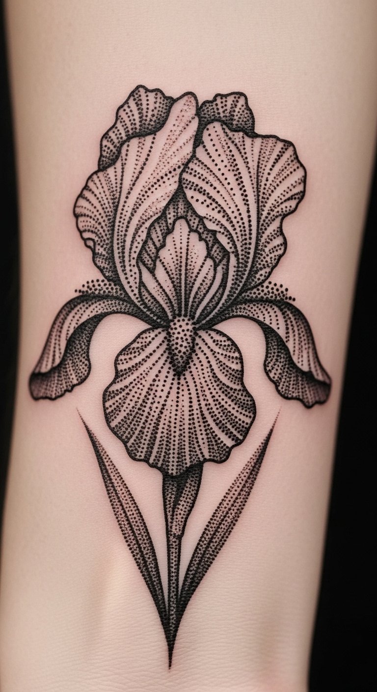 A dotwork iris uses dots for texture. Envision points making the flower on your wrist. This is intricate yet simple. Dot with pens at home. Find dot experts for $50. Keep dots even. Try dot art. Get it step by step. Clean gently. Use dot stickers.