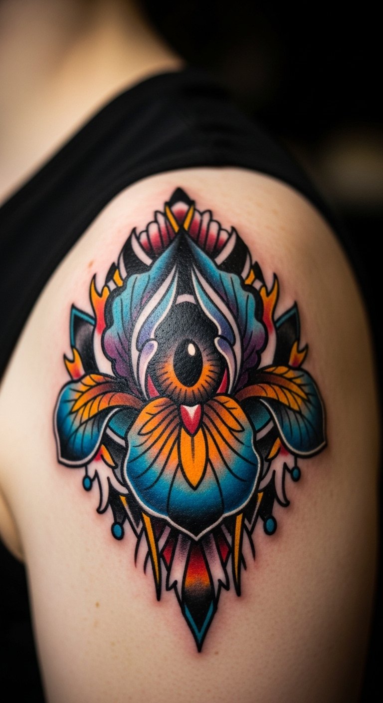 A neo-traditional iris revives old ways. Think of vivid colors in a timeless look on your shoulder. This is classic with a spin. Sketch traditional designs. Artists offer for $100. Use bold inks. Draw first. Schedule easily. Care with balms. Try old-style prints.