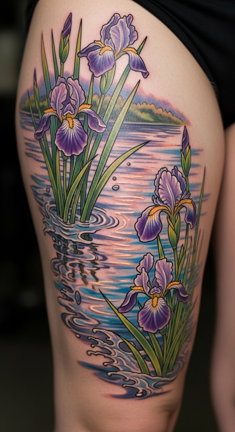 A water iris scene adds water to the mix. Picture ripples around the flower on your thigh. This creates a full picture. Draw scenes with blue pens. Find for $120. Include details wisely. Sketch the whole thing. Do in parts. Protect from water. Use scene decals.