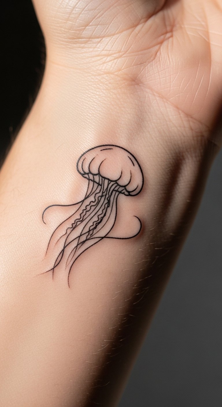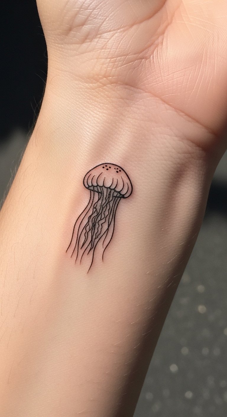 Tiny tattoos fit tight spaces. A wrist jellyfish looks elegant. Draw it small on paper with a fine-tip pen. Practice makes it easy. No big expenses needed. Look for tattoo flash sales online. They’re budget-friendly for small work. Personalize with a single wave line. Use thread to outline on your wrist first. It’s free and helps plan. Hide it under watches or show it freely. Try temporary tattoos from packs. They cost less than $2. This design suits busy days. Keep it simple and meaningful.
