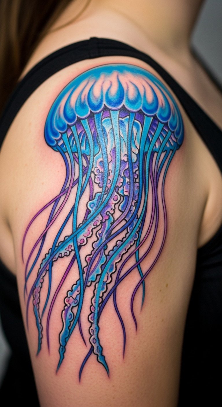 Bright hues make this tattoo pop. Think blues and purples for the jellyfish body. Place it on your shoulder for easy show. Draw color ideas at home with markers. Pick shades from old paints you have. This saves money on supplies. Visit a local shop for affordable color work. Ask for samples during a free consult. Add glittery effects with household items like shiny paper. Snap a photo to share online for feedback. This design flows with your movements. Wear loose shirts to highlight it. Try washable markers on your skin first. It costs pennies and shows how it looks. Go bold with colors that match your style.