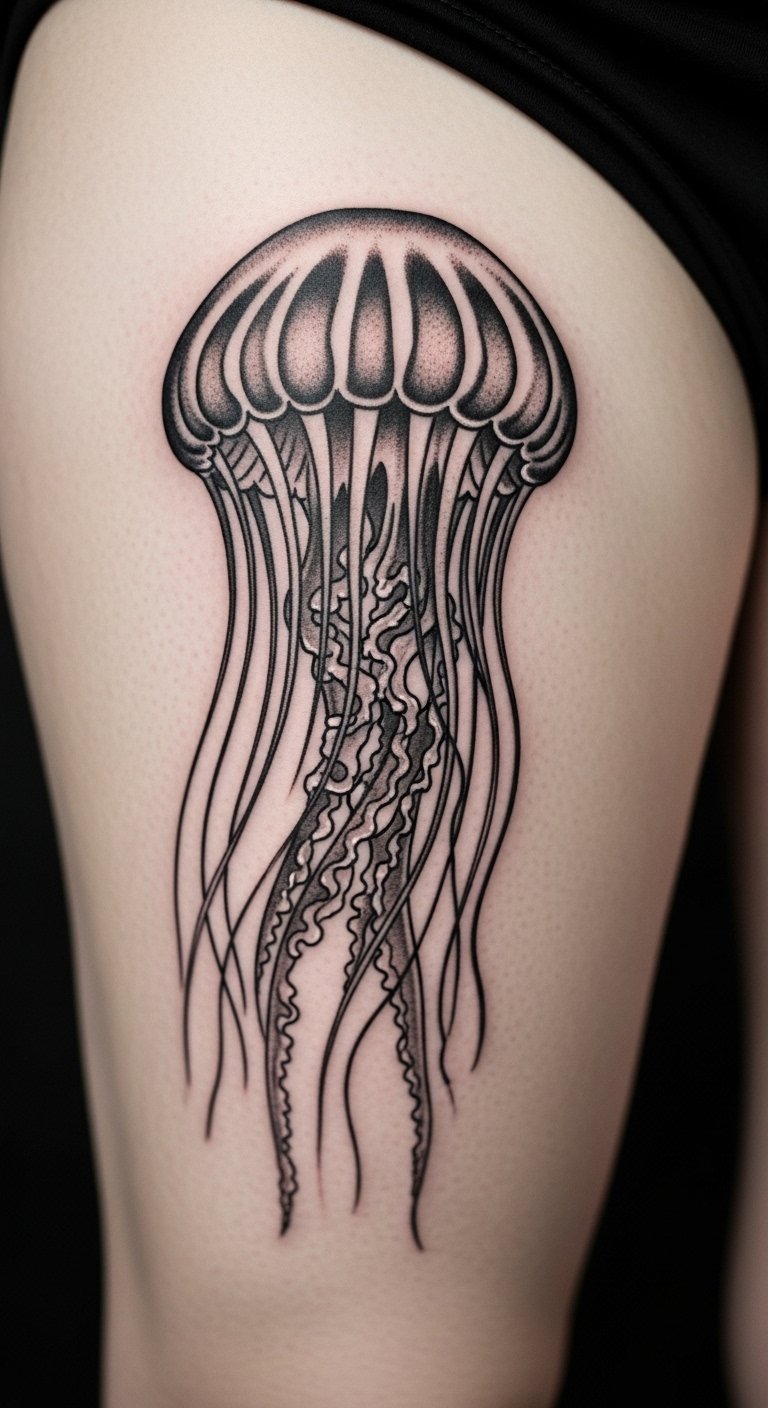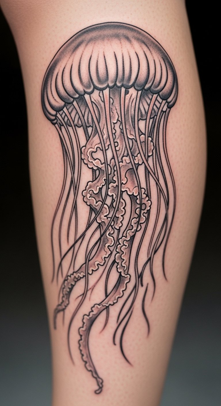 Black and grey offers classic appeal. Shading makes the jellyfish pop. Put it on your thigh for space. Sketch shades with a graphite pencil at home. Layer for depth. Free and easy. Search for grey-scale artists with budget prices. Many have portfolios. Make it yours with extra lines. Use charcoal sticks for practice. They’re cheap at art stores. Wear shorts to reveal it. Or pants for normal days. Experiment with grey markers on paper. Fast and effective. This style lasts well.