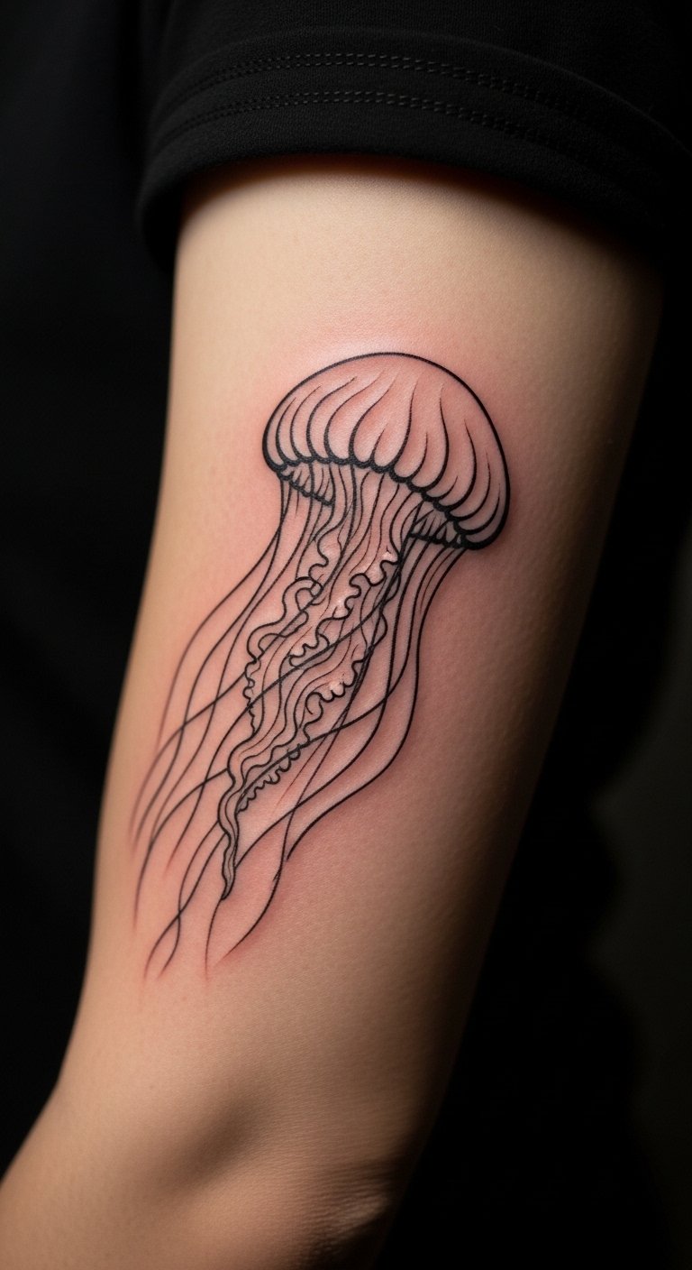 Picture a clean, simple jellyfish shape. This design uses just a few lines to show the creature’s form. It fits small spots like your wrist or ankle. You can draw it yourself on paper first. Grab a pencil and sketch wavy lines for tentacles. This takes minutes and costs nothing. Talk to a friend who draws for tips. When ready, find a budget artist online. They charge less for basics. Keep it meaningful. Add a personal twist, like a small wave. This tattoo hides easily under clothes. Wear it daily without fuss. Try temporary ink kits from the store. They let you test the look for under $10. Go for this if you want something understated yet powerful.