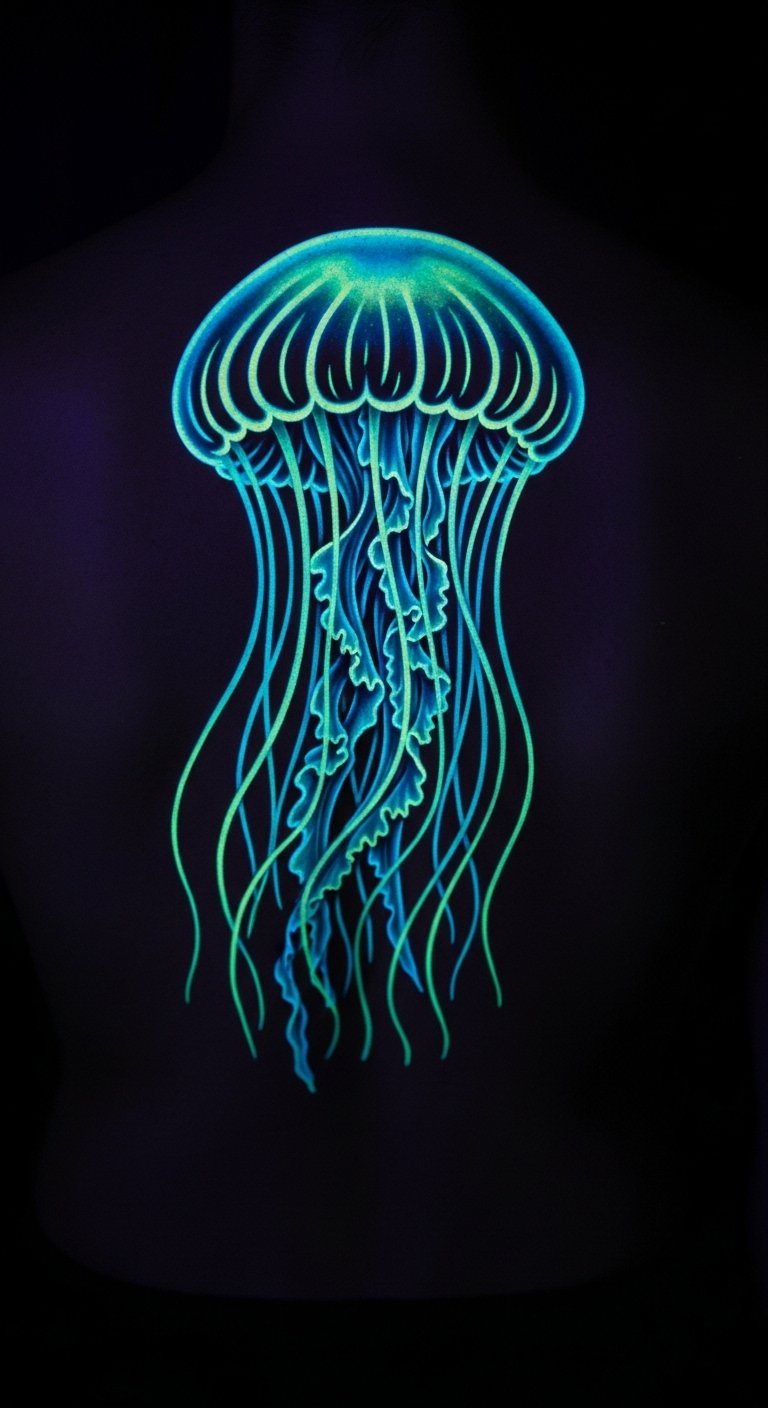 UV ink makes it shine in the dark. Jellyfish tentacles glow blue or green. Place it on your back for surprise reveals. Draw glowing ideas with fluorescent markers at home. They’re cheap and light up under a phone flash. Find artists who use UV ink at affordable rates. Check online for promotions. Add simple patterns like dots for extra pop. Use glow-in-the-dark tape to test on your body. It costs little and works fast. Cover it during the day. Light it up at night parties. Experiment with phone UV lights for previews. This adds a fun twist to your ink.