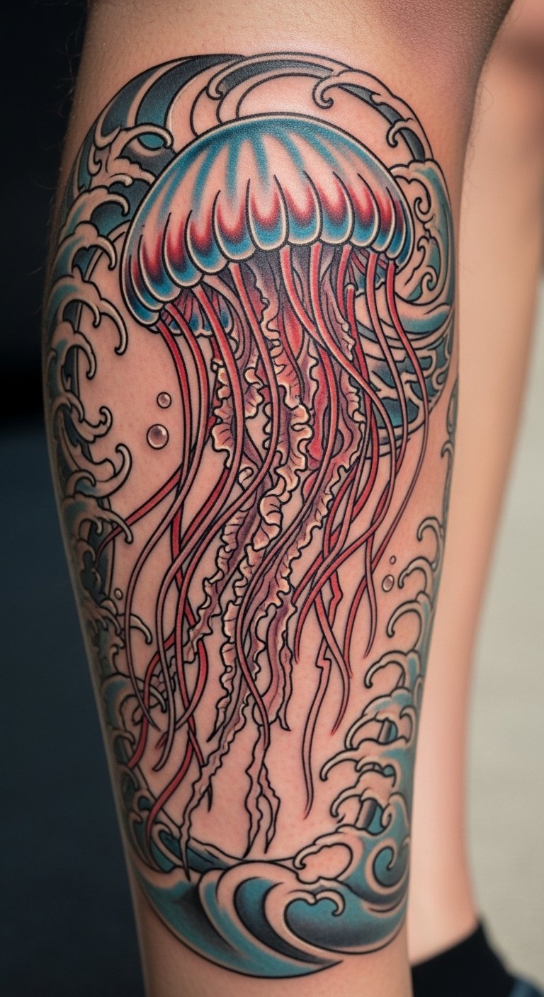 This honors the sea. Waves around the jellyfish. Place it on your leg for theme. Draw ocean scenes with blue pens. Personal touch. Search for themed artists at budget prices. Many have ideas. Add shells for extra meaning. Use sand and sticks to sketch outside. Free activity. Show it at the beach. Or hide in daily wear. Try sea glass for inspiration. Collect it yourself. This tattoo celebrates nature.