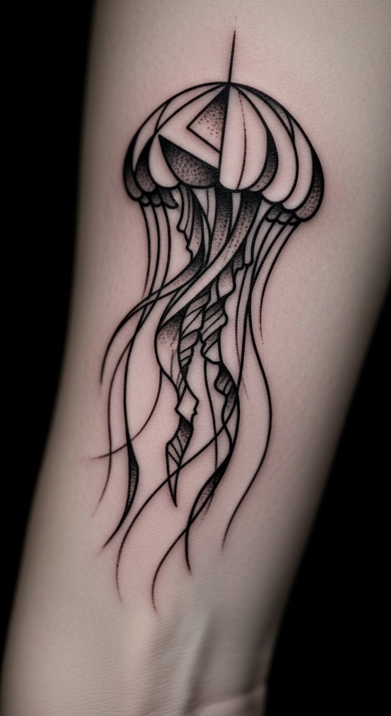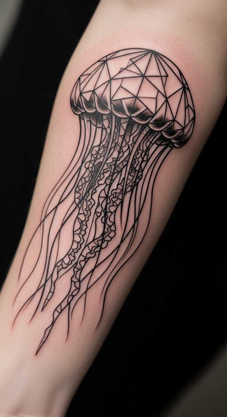 Geometry adds structure. Shapes inside the jellyfish. Put it on your forearm for detail. Draw grids with a ruler. Precise and free. Search for geometric pros at low costs. They create. Personalize with triangles. Use graph paper for planning. Handy. Show it in short sleeves. Or cover up. Try cutting shapes from paper. Simple. This design is modern.