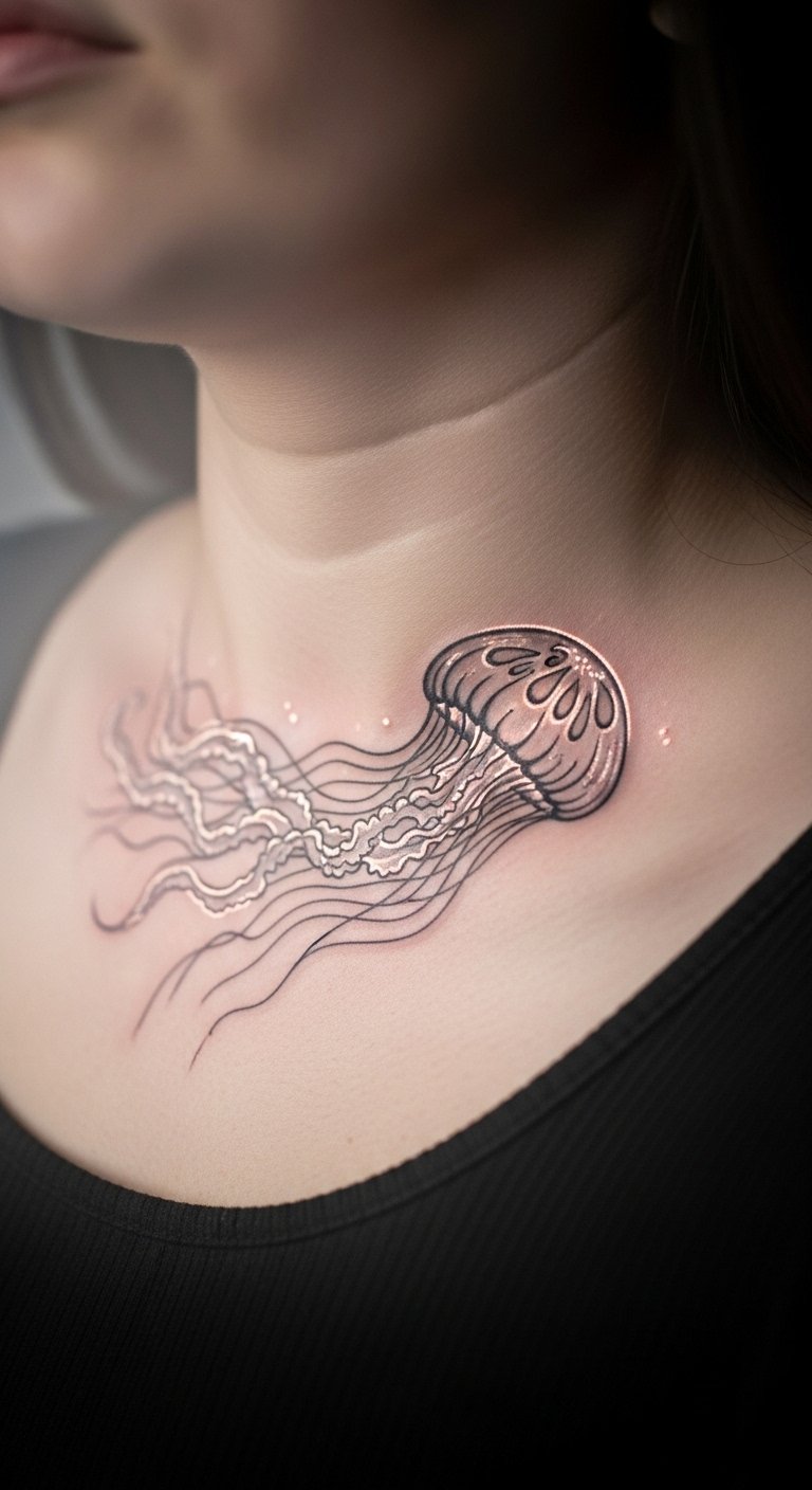 Soft effects give it a dreamy feel. Light rays around the jellyfish. Place it on your collarbone for grace. Sketch light lines with a soft pencil. Easy at home. Find ethereal specialists online for deals. They often have options. Personalize with faint stars. Use tissue paper to blur drawings. It creates a soft effect cheaply. Drape a scarf to highlight it. Or leave it bare. Test with white-out on paper. Quick and free. This design adds magic to your skin.