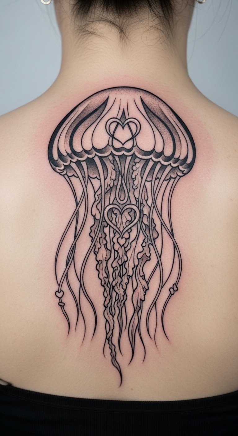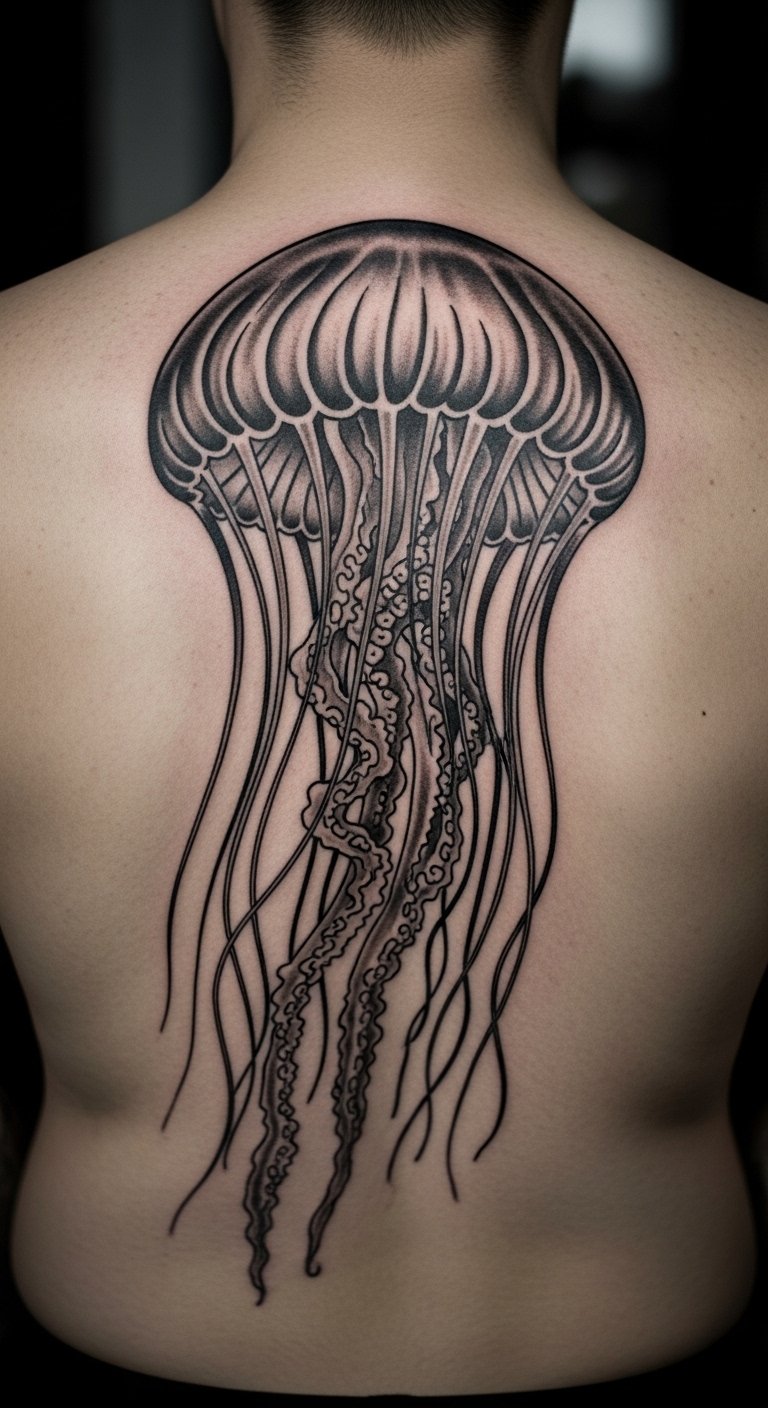 A full back makes a statement. Large jellyfish spreads out. Plan it with a big sketch on paper. Use what you have. Look for back piece deals from artists. They vary in price. Add personal details. Tape paper to your back for a mock-up. Easy. Wear backless tops to show. Or shirts for cover. Practice with large drawings. Free and helpful. This design dominates.