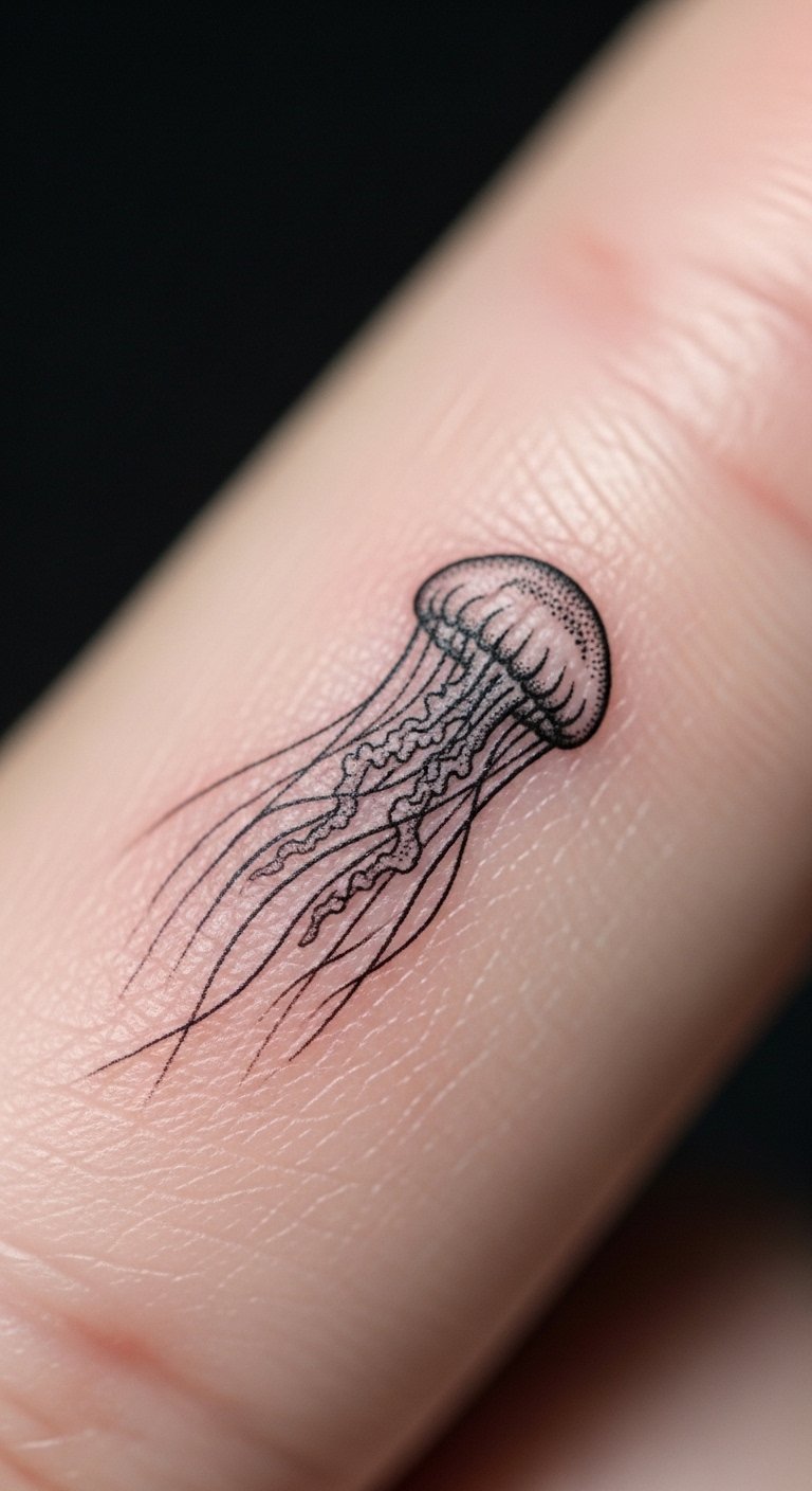 Finger tattoos are subtle. A tiny jellyfish works great. Sketch it small with a fine pen. Focus on details. Free to do. Look for micro specialists with low costs. They offer quick sessions. Add a dot for flair. Use a toothpick to draw mock-ups. It’s handy and free. Wave your hand to see it move. Or wear rings over it. Test with henna pens. Cheap and temporary. This design fits a modern vibe.