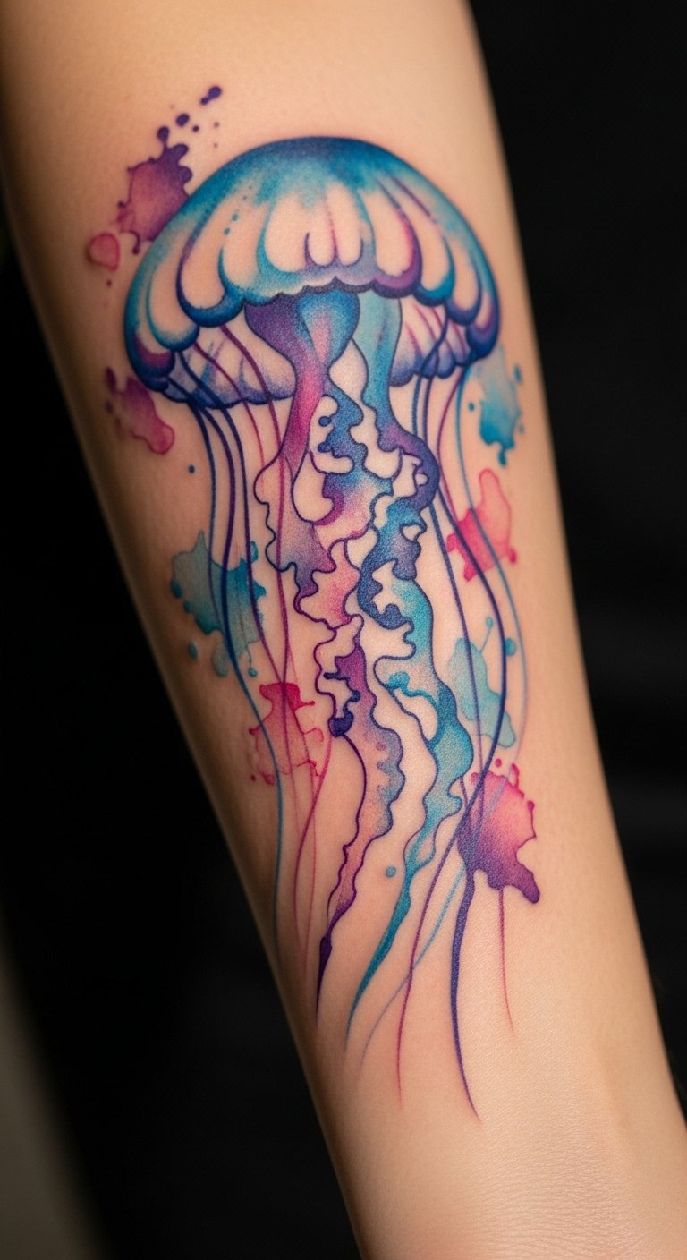 Watercolor looks painted on. Blended colors for the jellyfish. Put it on your forearm for view. Practice blending with water and markers at home. It’s simple. Find watercolor tattooists with deals. Check their work. Add washes of color. Use old paints for tests. Under $5. Roll up sleeves to display. Or cover as needed. Experiment on paper first. Easy and fun. This style feels artistic.