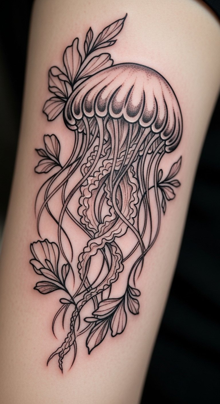 Flowers soften the look. Petals around the jellyfish. Place it on your arm for balance. Draw flowers with basic pencils. Quick at home. Search for accent artists with good rates. They add flair. Make it yours with colors. Use flower petals to trace shapes. Free find. Flex your arm to see the mix. Or cover casually. Try pressing flowers for ideas. Simple. This combines beauty.