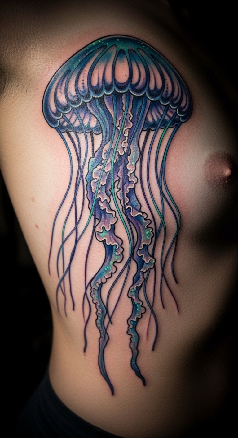 This style mimics a real jellyfish. Long tentacles add drama. Put it on your leg for a big canvas. Practice drawing details on paper with a regular pen. Use free apps on your phone to trace shapes. Find an artist who does realism without high fees. Look for deals on social sites. Add your own flair, like a tiny fish nearby. Use string at home to mimic tentacle curves. It helps visualize the flow. Cover it with pants for work. Or show it off at the beach. Test with henna from a drugstore. It’s cheap and washes off. This tattoo tells a story of ocean life.