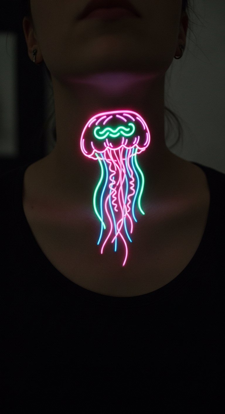 Neon edges make it vibrant. Glow lines for the jellyfish. Place it on your neck for pop. Sketch neon with highlighters. Fun at home. Find glow artists with budget options. Check nights. Add sparks. Use LED lights to test. Cheap thrill. Turn heads with it. Or hide under collars. Experiment with glow sticks. Under $1. This adds energy.