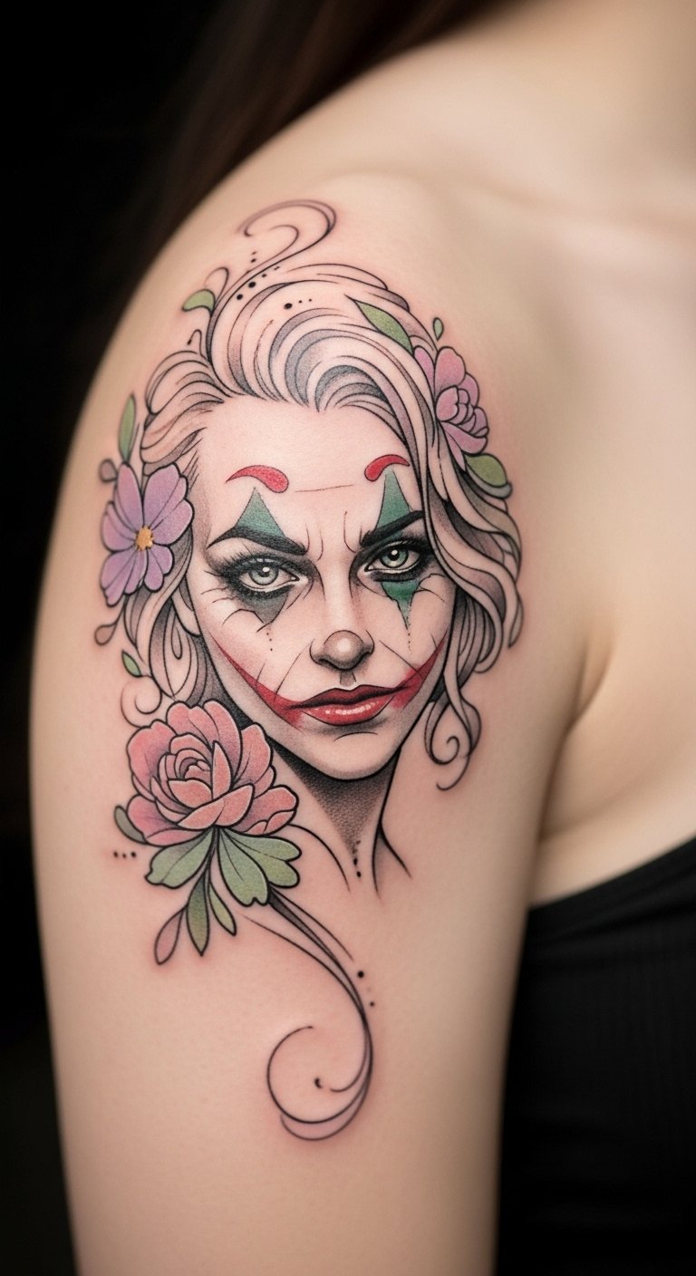 Feminine Joker tattoos add curves and flowers. Try it on your shoulder for elegance. Blend in roses for a soft touch. Look for female artists with affordable rates, starting at $80. DIY with fabric markers on clothes first. Keep it small for quick sessions. Pair with dresses for outings. This version fits everyday fashion without fuss. Customize with personal elements.