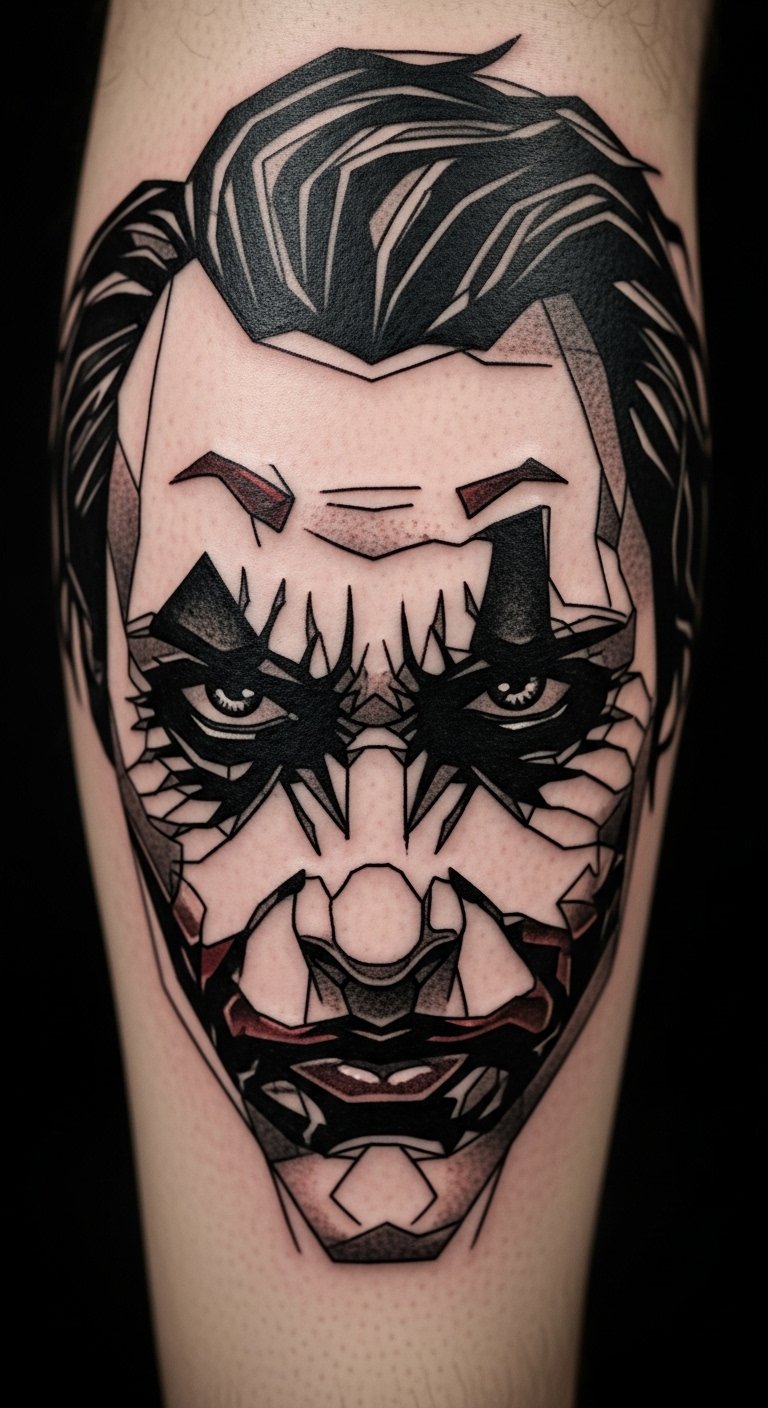 Geometric Joker uses shapes for a modern vibe. Place it on your calf for balance. Combine triangles for interest. Shop online for geometric stencils under $5. Choose artists who do precise work for $90. Stick to black ink for savings. Wear pants to hide or show as needed. This design suits clean styles on a budget. Practice with graph paper at home.
