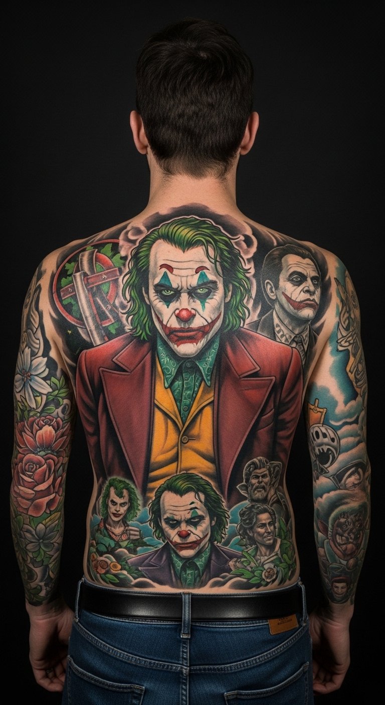Back tattoos with Joker themes cover large areas. Build in stages to manage costs. Begin with a central face. Look for back session discounts at $150. DIY by mapping on a pillow. Use thematic layers. Cover for formal events. This design tells a big story affordably.
