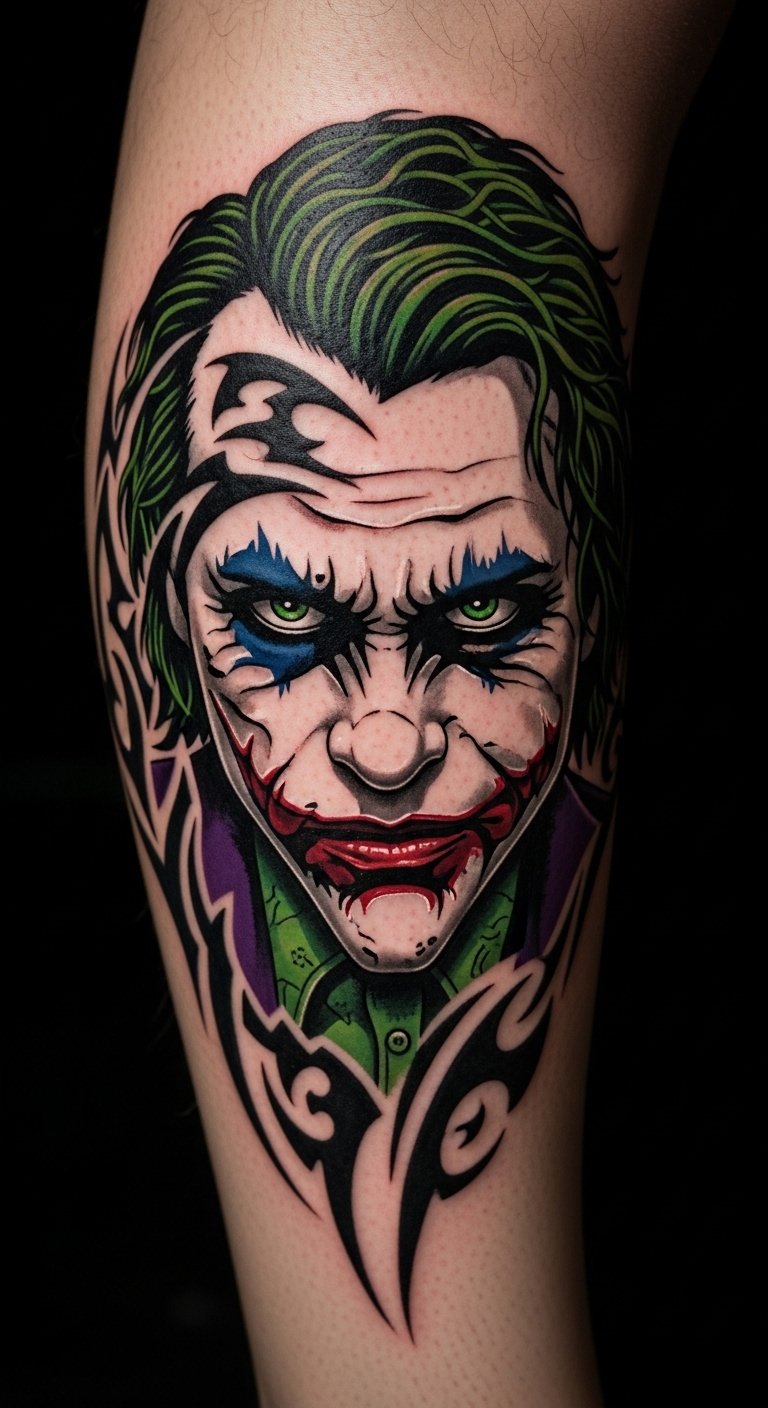 Tribal Joker fuses patterns for strength. Place on your leg for flow. Blend in tribal swirls. Look for fusion artists at $90. DIY with tribal stencils. Use black outlines. Wear jeans to hide. This design merges cultures affordably.