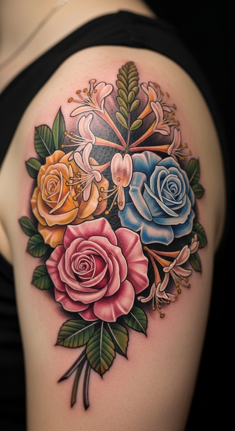 Mix roses and honeysuckle in a bouquet for a full story. This combo shows love and happiness together. Sketch it on paper with colored pencils for a quick plan. Use free apps on your phone to combine elements. Put it on your shoulder for a bigger canvas. Opt for a smaller version to cut costs. Try drawing with everyday markers at home. Bouquet for emotions adds depth. This design lets you tell your tale affordably. Get creative with household items like string to outline shapes.