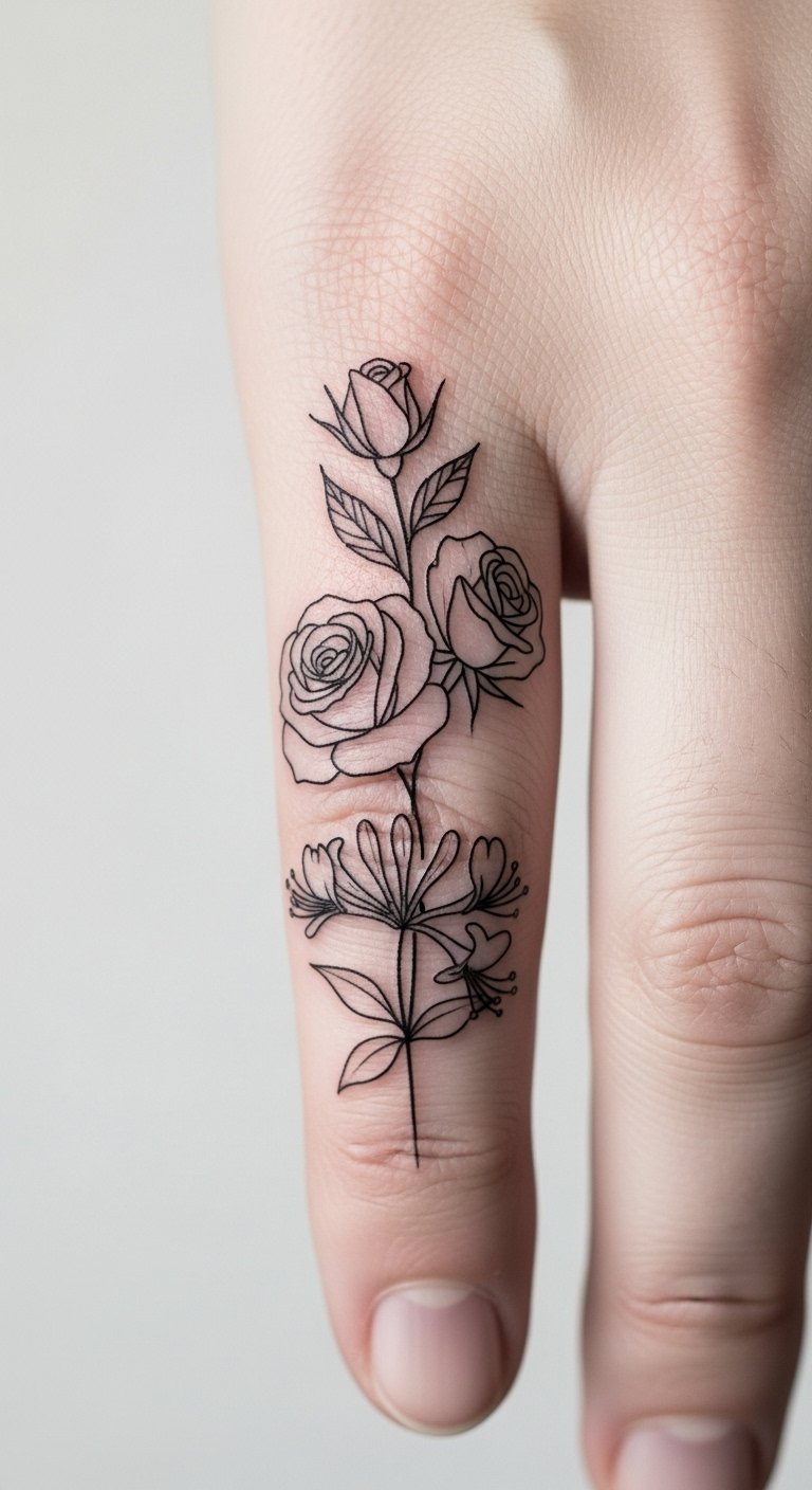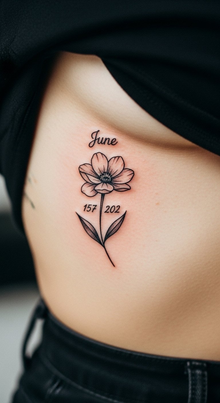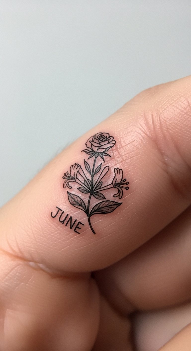A small finger June tattoo keeps it subtle. Include both flowers for meaning. Sketch on your finger with a fine tip. It’s an easy home test. Fingers fit under rings. Use free small designs online. Finger tattoo for daily wear. Keep it basic for low cost. Practice with nail polish.