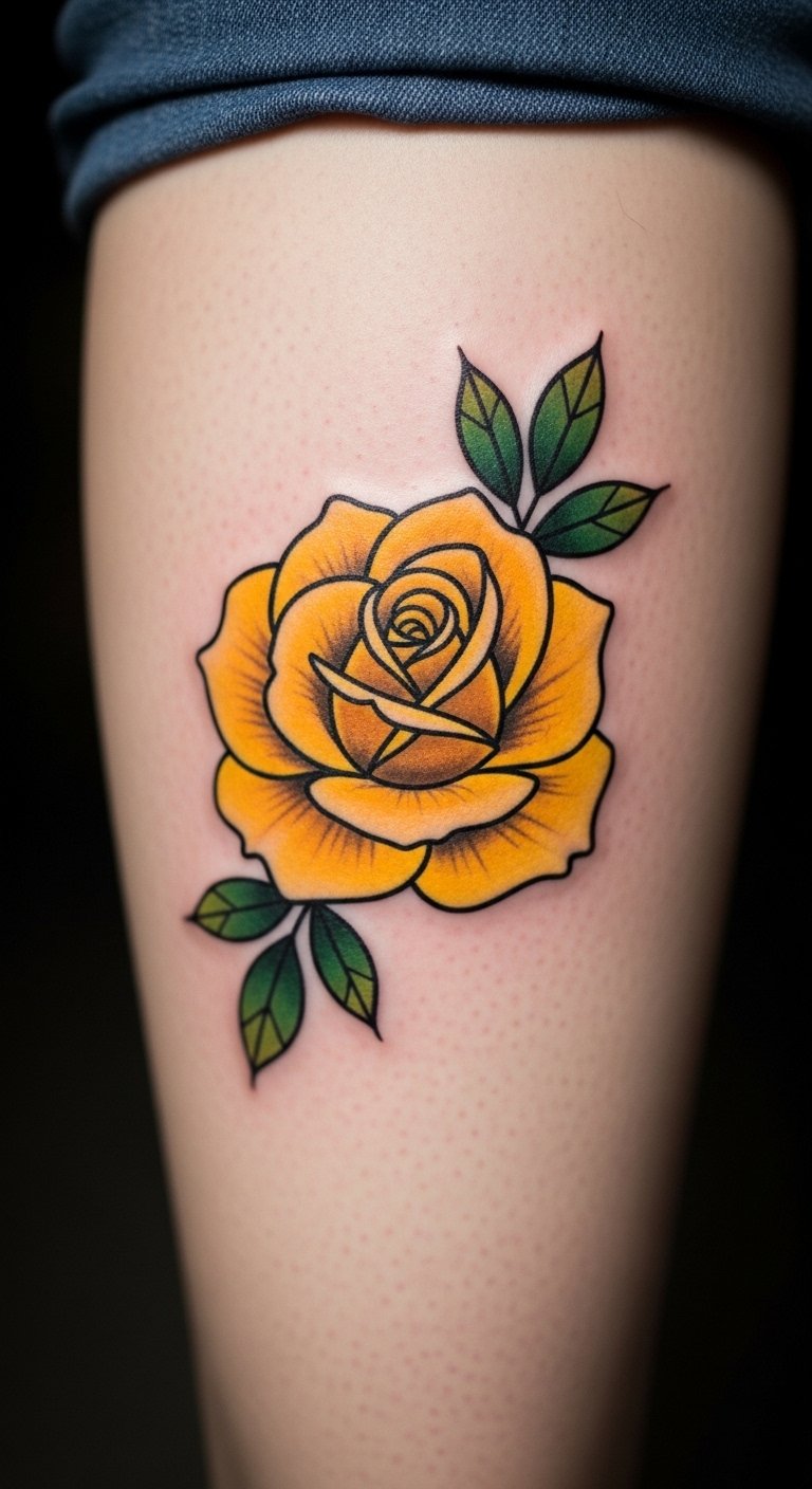 Choose a yellow rose for friendship vibes. This color means happy connections. Try drawing it on paper with yellow markers. It’s an easy DIY. Position it on your calf for a hidden gem. Find cheap yellow inks for home tests. Yellow rose brightens things up. Make it compact to save money. Adapt with everyday art supplies at home.