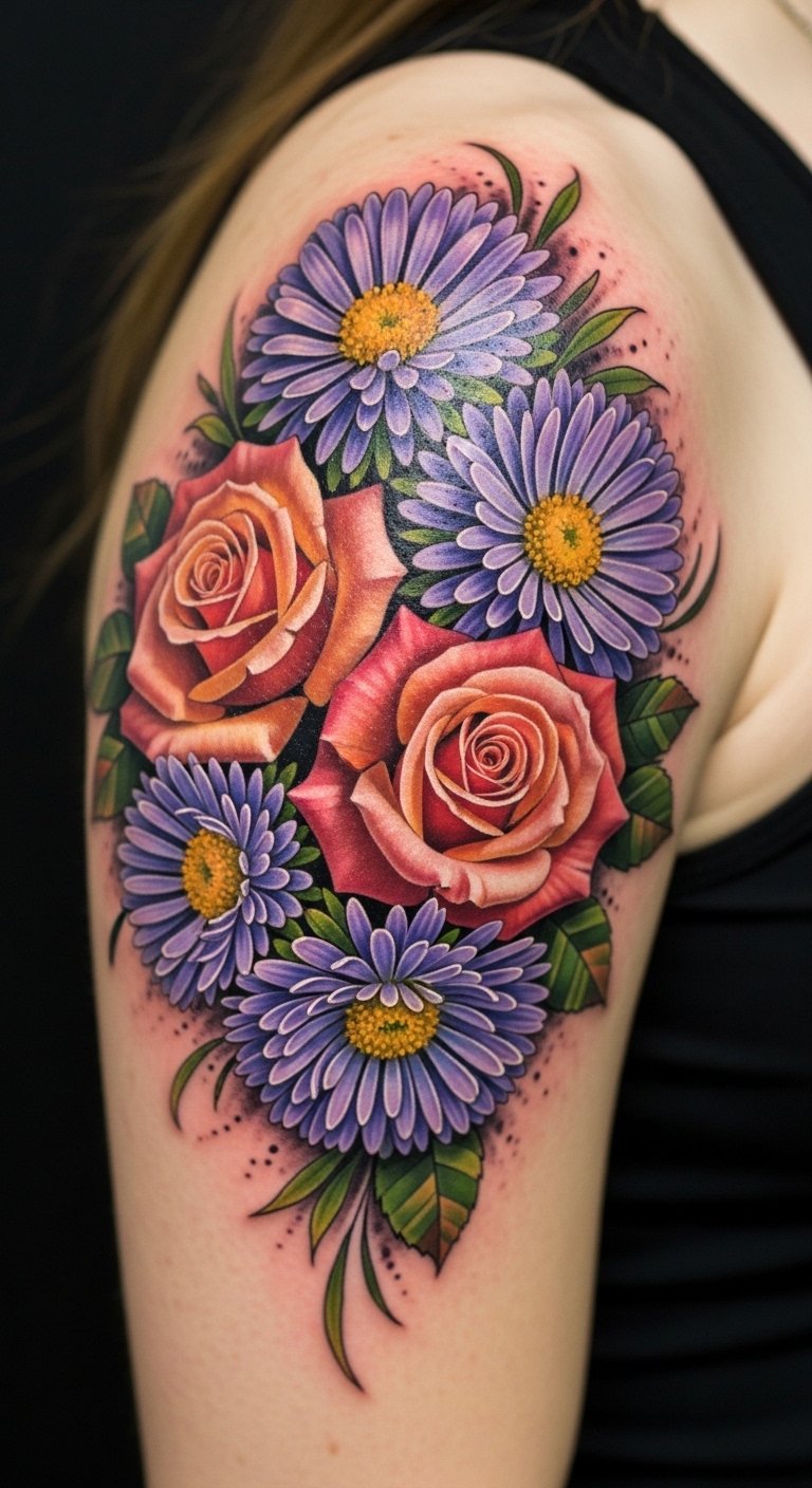 Combine rose and aster for a duo effect. Roses pair with asters for wisdom and love. Draw both on paper to mix ideas. It’s a fun home project. Place on your shoulder blade for balance. Find free combo templates online. Flower pair creates depth. Go for a modest size to stay budget-conscious. Experiment with colored paper at home.