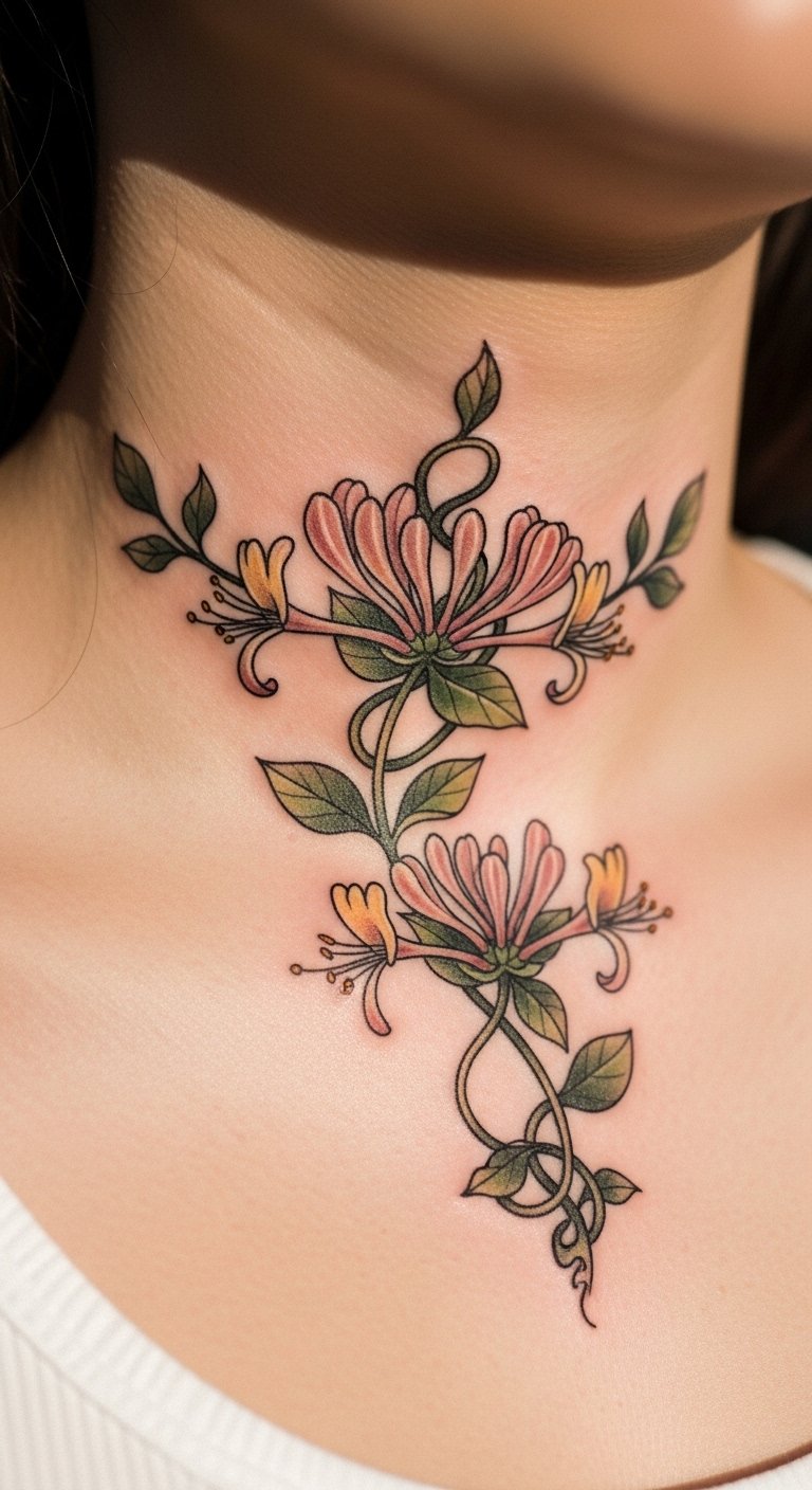 Honeysuckle on your neck focuses on happiness. Draw vines with curves on paper. It’s a quick DIY. Necks offer versatile spots. Download happiness-themed ideas. Honeysuckle theme lifts spirits. Make it small for affordability. Use yarn to outline at home.