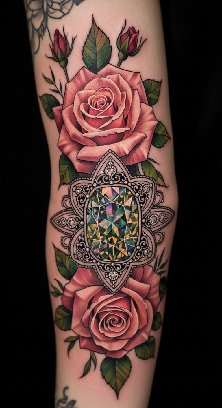 Integrate birthstone with roses for layers. Add a stone shape for personal touch. Sketch on paper with colored dots. This keeps it cheap. Arms show it off. Use free integration guides online. Stone design deepens meaning. Try with beads at home.