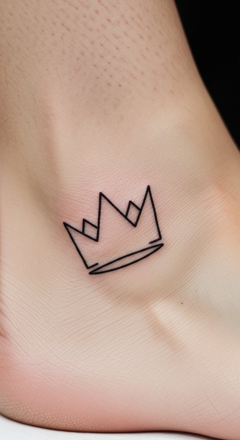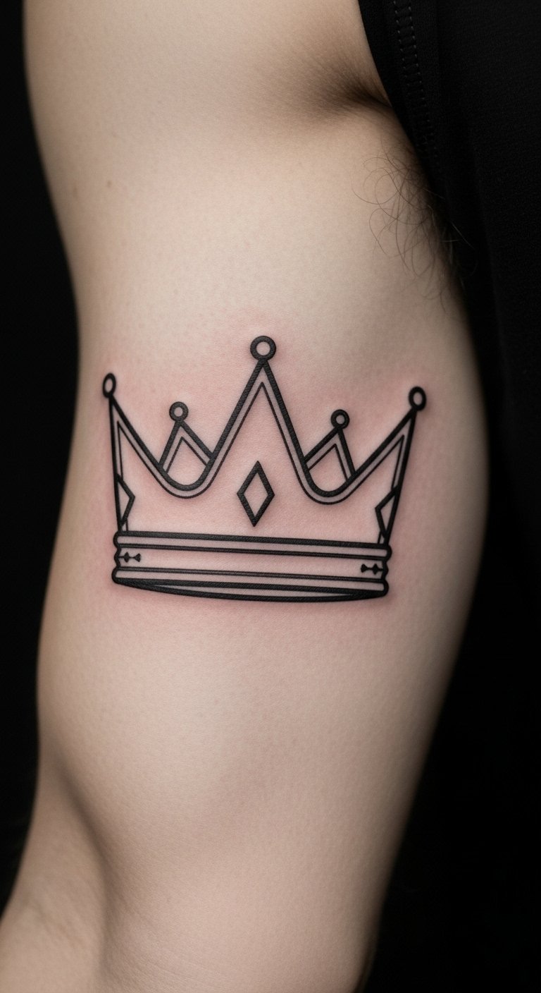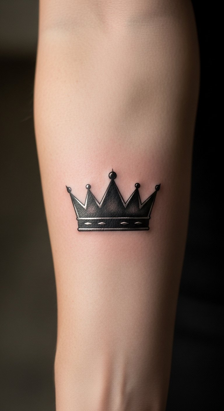Think about a classic king crown tattoo. It stands for confidence and rule. You see a bold outline on the skin. This design works for anyone wanting to feel strong. Pick a small size for less pain. Go to a local artist for a quick session. It costs around $50 to $100. Try sketching it at home with a pen on paper. Add your own twist, like a small gem. Keep it basic for easy touch-ups. This tattoo reminds you of your inner strength every day.
