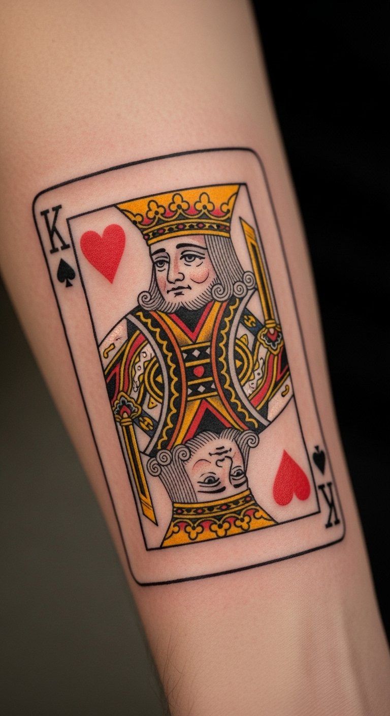 Playing card king tattoos bring a game theme. Imagine a king of hearts on your arm. Keep it black and white for affordability. Artists offer this for about $90. Draw cards at home to inspire you. Use it to represent luck in life. It’s a playful choice.