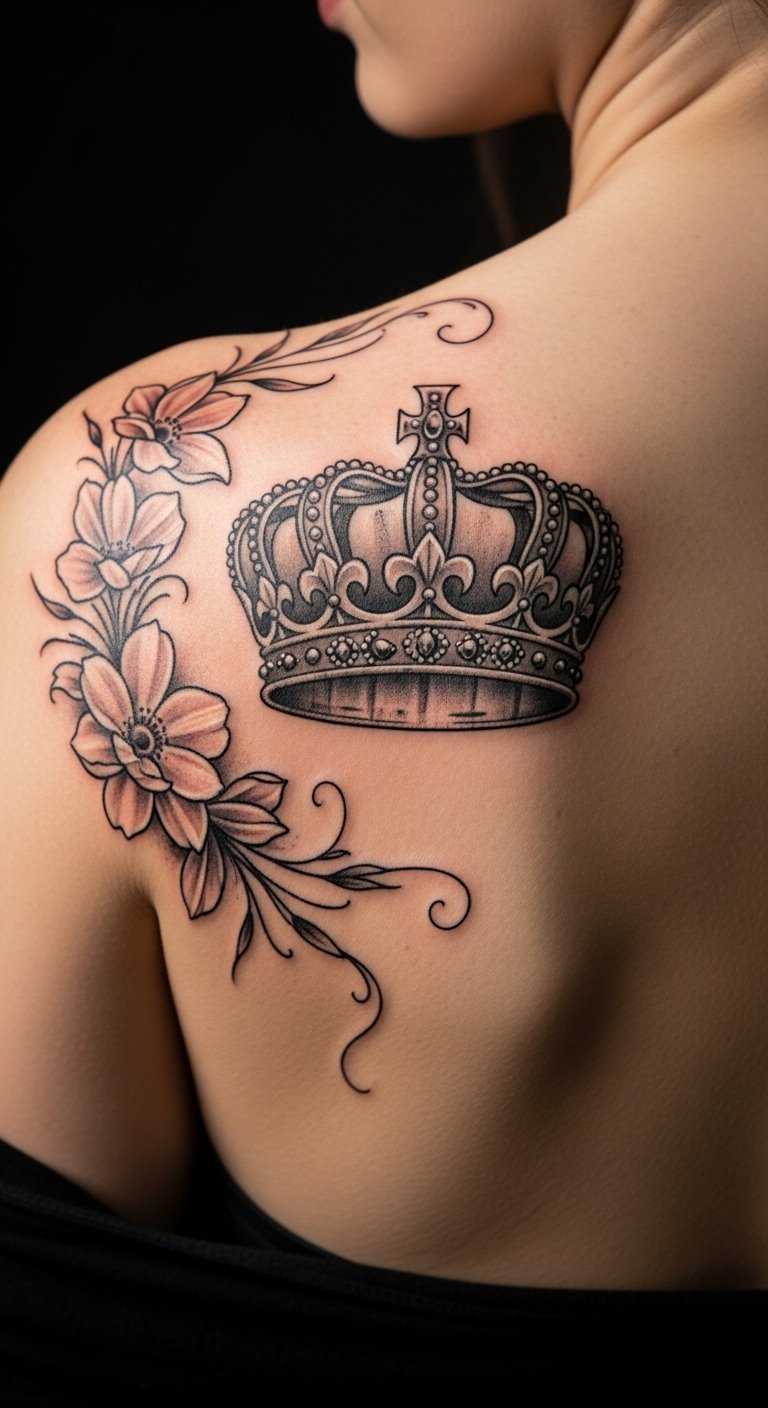 Queen crown with flowers tattoos mix beauty and strength. Flowers surround the crown. Put it on your shoulder for grace. This could be $90. Sketch flowers with colored markers. Choose blooms that hold meaning. It feels personal and easy.