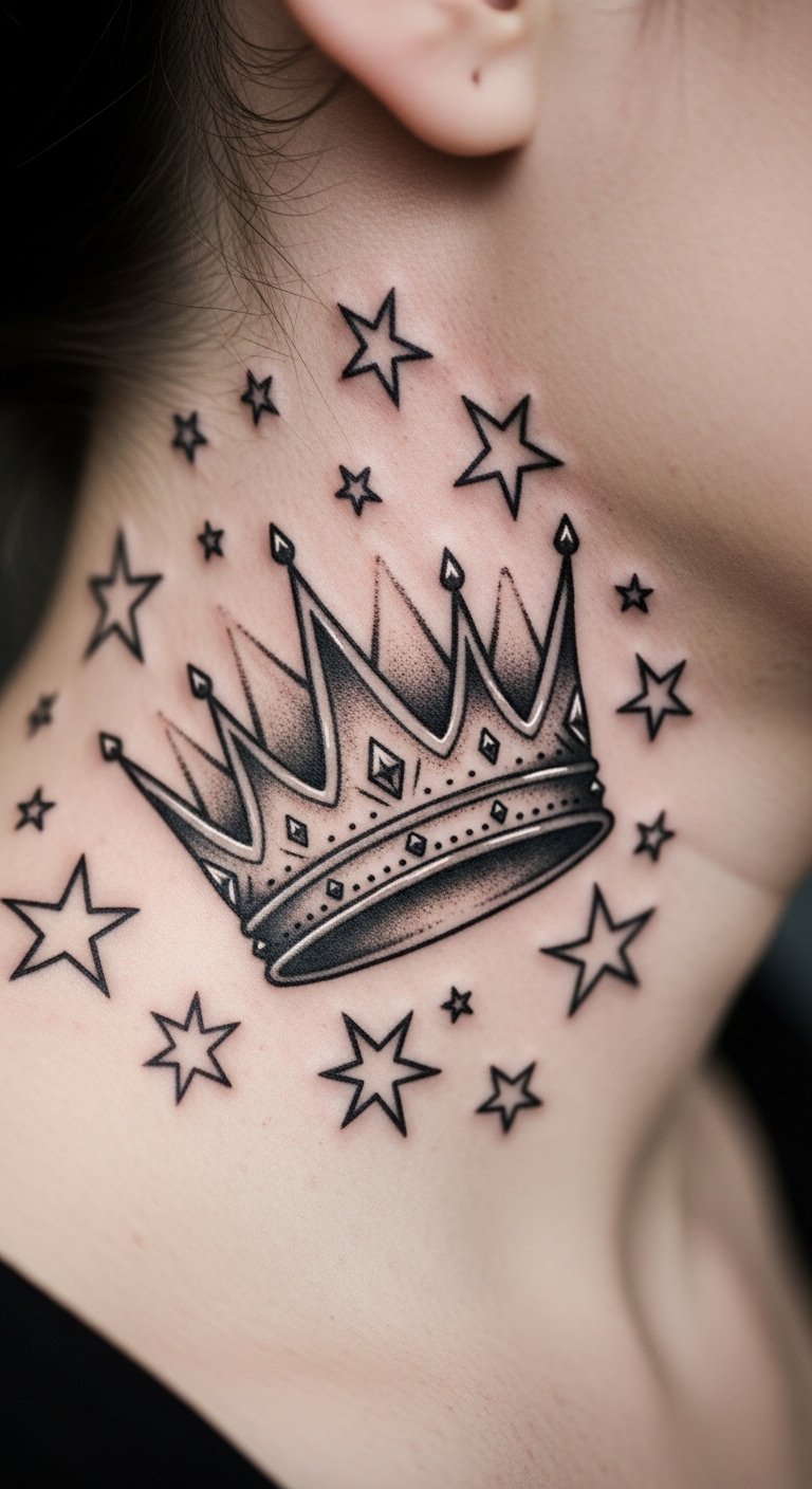 Star-incorporated crown tattoos add a cosmic element. Stars dot the crown. Try your neck for a bold spot. This runs about $70. Draw stars with stencils at home. Pick stars that inspire you. It’s a quick way to shine.