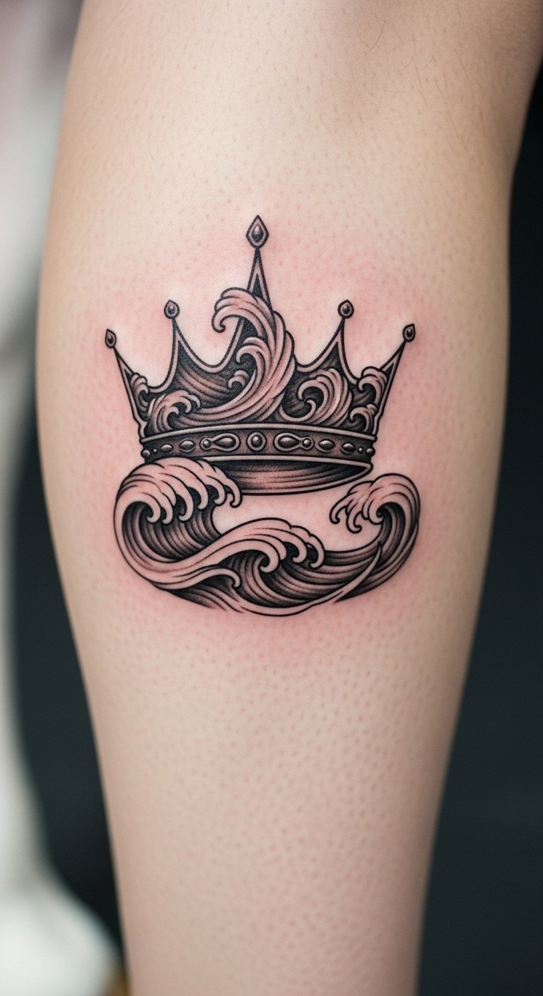 Wave-style queen tattoos bring movement. Waves flow from the crown. Place it on your calf for flow. Artists charge around $90. Practice with wave drawings. Make it wavy for a dynamic look. Feels fresh and achievable.