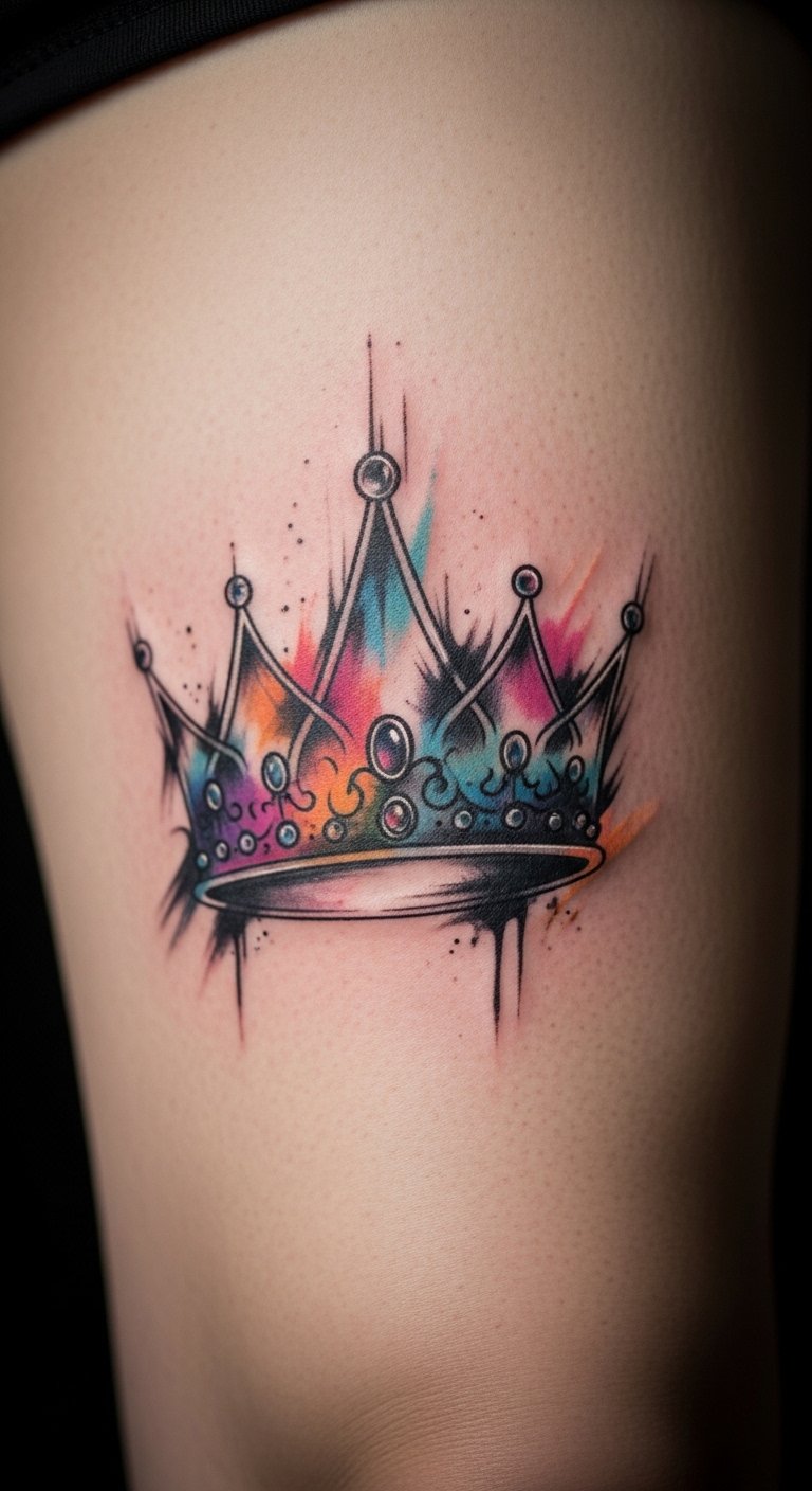 Abstract queen crown tattoos play with forms. Swirls and shapes make the crown. Try your thigh for space. Expect $100 for this. Experiment with abstract art on paper. Make it your own style. It’s artistic and straightforward.