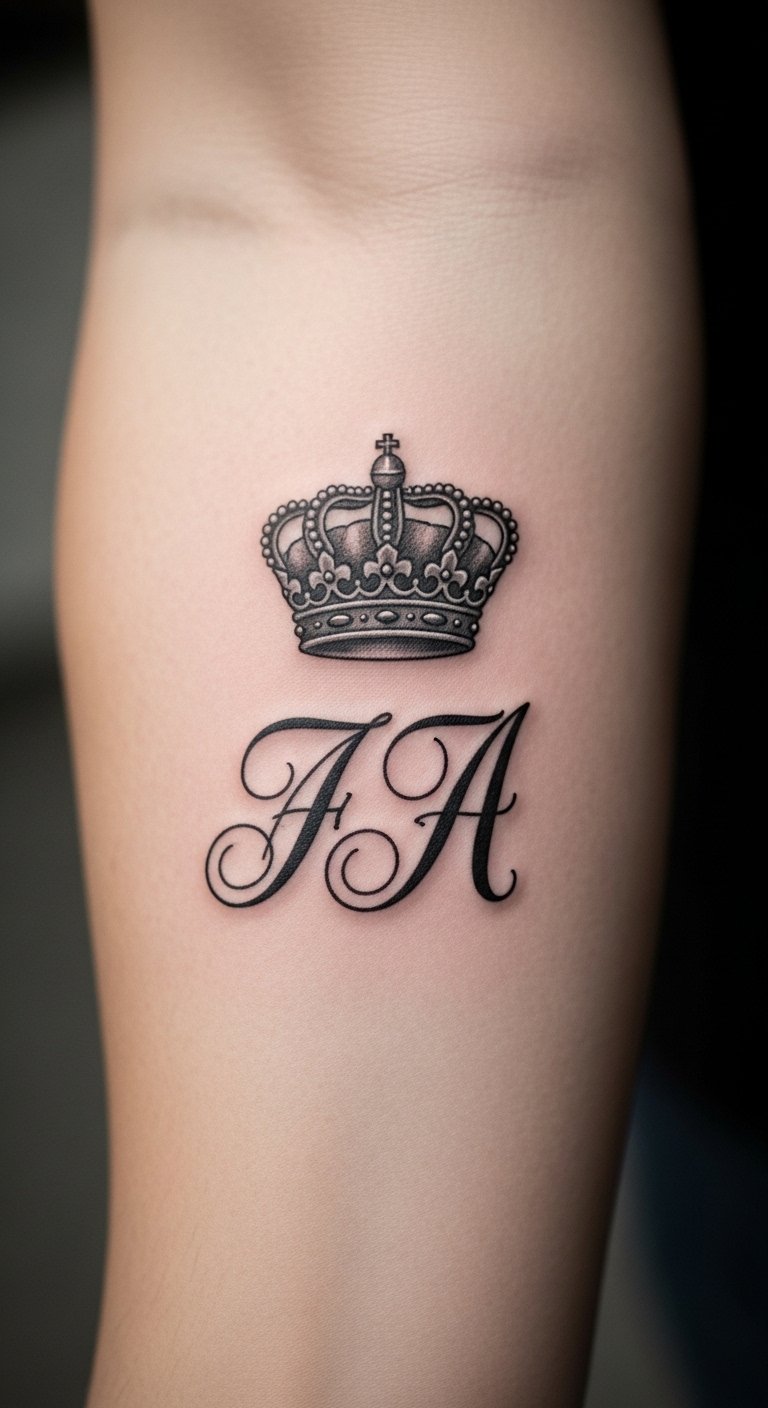 Custom initial crown tattoos make it yours. Put your initials in the crown. Choose your forearm for daily sight. This costs about $70. Write initials on templates first. Tailor it to your story. Easy way to claim your design.