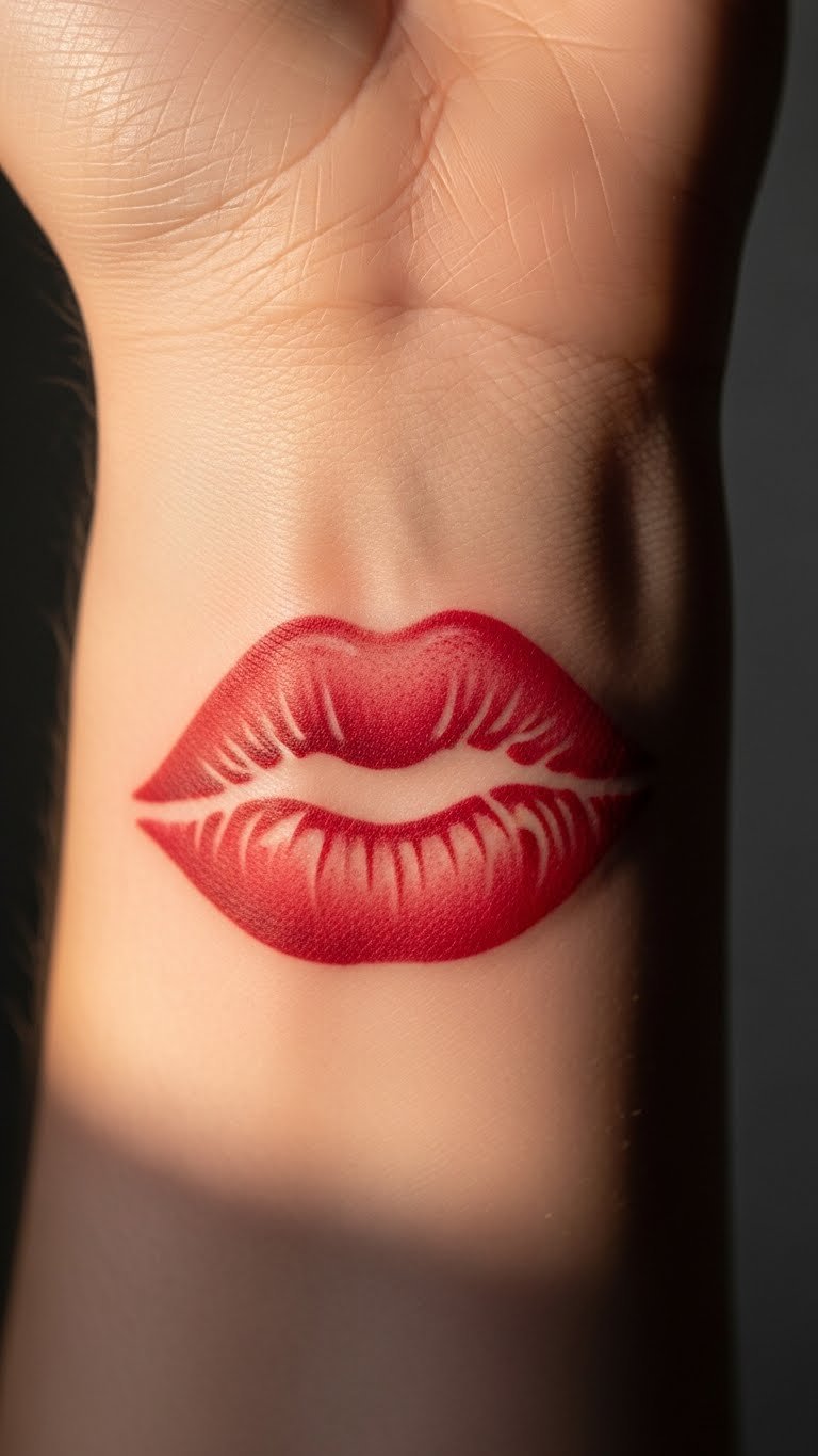 A simple red lip print tattoo says it all with elegance. Picture a vibrant design that fits neatly on your wrist. This style works for first-timers. Start small to keep costs low—many artists charge under $100 for basic pieces. If you’re DIY-curious, sketch it on paper first with markers. Choose a spot that’s easy to hide or show, like the wrist, for everyday wear. Bold the key: red lip print stands out yet stays subtle. Pair it with a heart for added flair, but keep it minimal. Think about your daily routine; a wrist tattoo peeks out from sleeves. Opt for black and gray ink if color fades fast. This design takes about an hour in the chair. Go to a local shop with good reviews to save money. Add a personal twist, like a faint outline of your partner’s lips. It’s a quick way to celebrate love without overcomplicating things.
