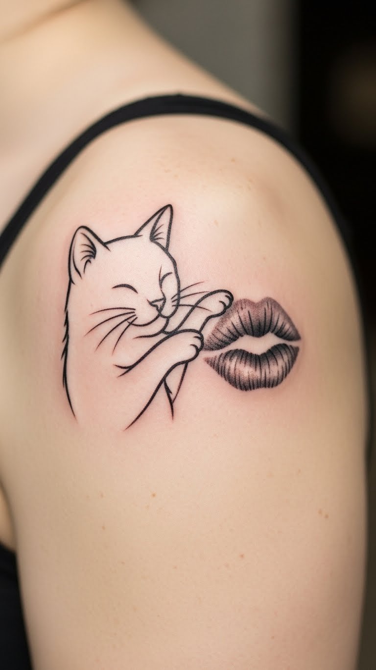 A playful cat and kiss combo adds whimsy to your tattoo. Envision a cute cat face next to puckered lips. Doodle it with markers at your desk for fun. Budget tattoos like this run about $90. Stick temporary versions on your arm to test. Position it on your shoulder for versatility. Cat and kiss mix affection with humor. Choose simple cat ears to keep it light. Find artists who do animal themes at affordable rates. Twist it with your pet’s features for a personal touch. This design pops in photos and daily life.