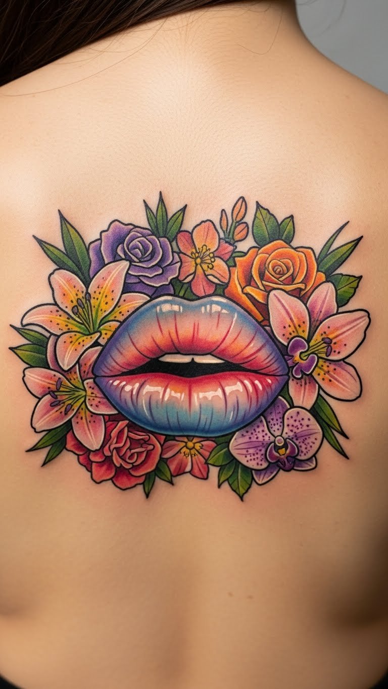 Floral framed lips on your back blend nature and romance. Imagine flowers circling the lips. Sketch flowers with pastels first. Prices start at $130. Press real flowers on paper for inspiration. Place on back for a grand scale. Floral framed lips grow your story. Choose common blooms for ease. Seek floral sale events.