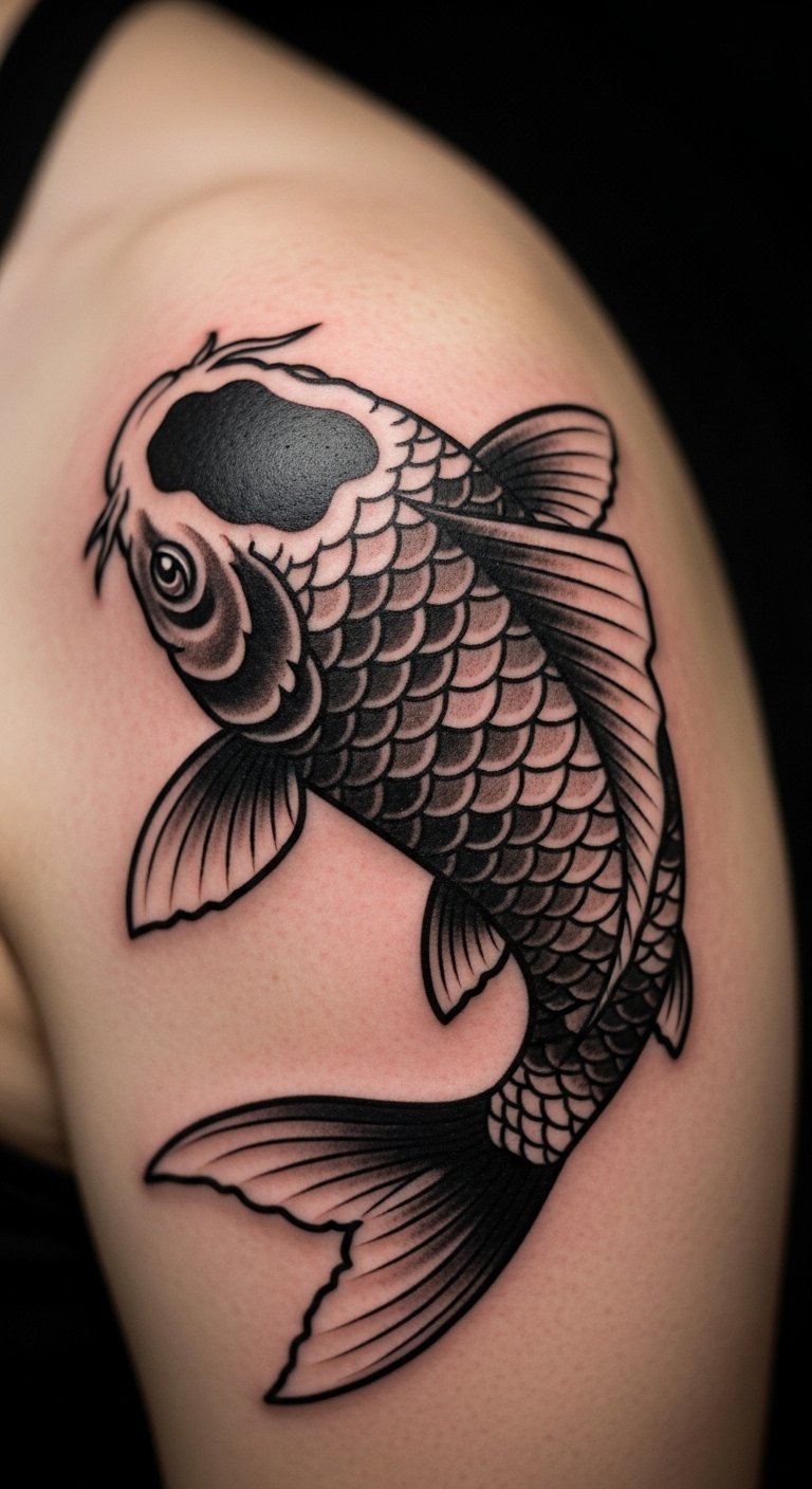 A black koi tattoo stands for pushing through tough spots. It shows you beat the odds. Many pick this for personal wins. Start by drawing a simple sketch at home. Use free apps on your phone to trace ideas. Keep colors basic to save on ink costs. Look for artists online who offer deals under $150. Place it on your arm for easy hide or show. Add waves around it for extra meaning. This design fits anyone seeking a reminder of their grit. Mix it with other elements like a small flower for balance. Get inspired by sharing ideas with friends. You’ll feel empowered every day. Try practicing with temporary tattoos first. They cost less than $5 and wash off easy. Pick a spot that motivates you during workouts.