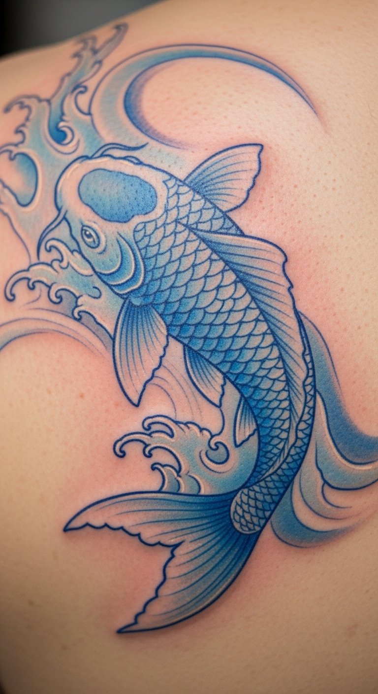 Blue koi brings peace to your skin. It stands for quiet and rest. People get this after stressful times. Draw it freehand on a mirror. Use blue pens you already own. Go for outlines only to keep it cheap. A small design runs about $80. Place it on your ankle for subtle wear. Add bubbles for a fun touch. This tattoo helps you breathe easy. Test ideas with stick-on versions from the dollar store. They stick for days. Share photos with buddies for feedback. You’ll carry calm wherever you go.