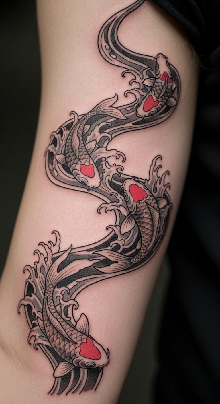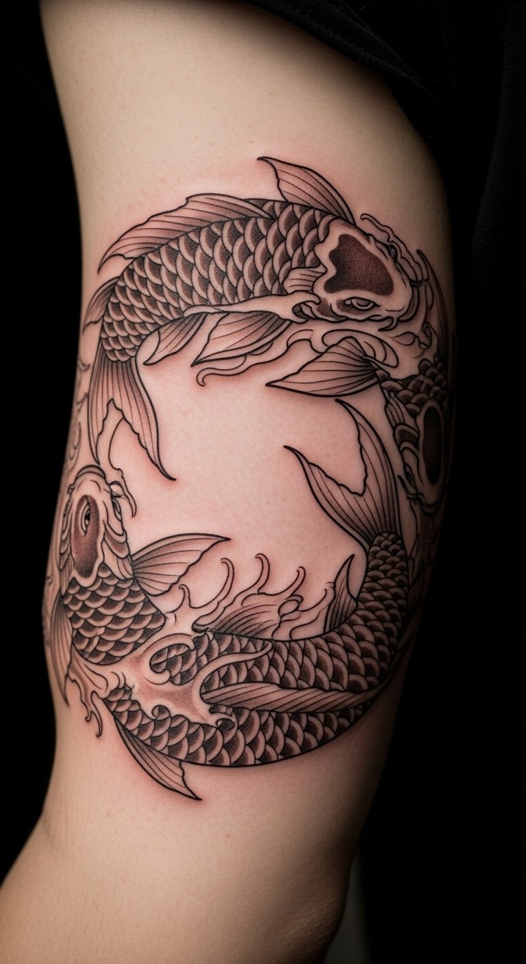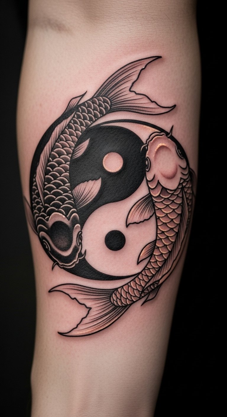 Yin-yang koi tattoos show balance in life. They mix opposites for harmony. Couples often pick this for bonds. Trace it with a free template online. Use black and white pens. Keep it symmetric to save money. A pair might cost $90. Put it on your calf for easy view. Add a small circle for unity. This design reminds you of steady paths. Try temporary pairs on paper first. They take seconds. Chat with partners about it. You’ll find peace in the flow.